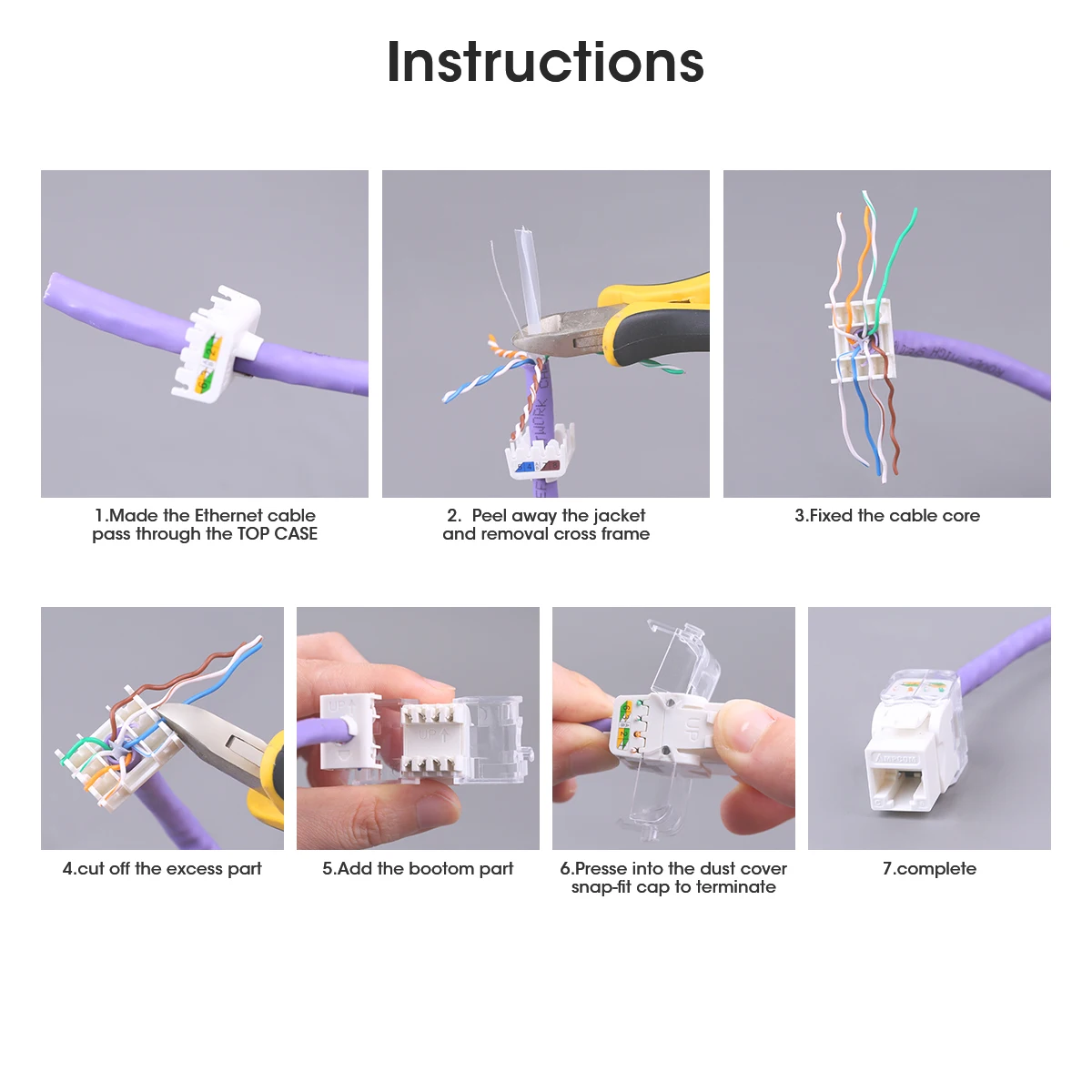 | Diseño sin herramientas de 180 gradosNo se requiere ninguna herramienta de perforación, ya que los conductores de cable pueden terminarse con una tapa de ajuste a presión de 180 grados que se presiona en su lugar. Es súper fácil de instalar y usar con este práctico Diagrama de separación de cables en la tapa. | Industrial RJ45-8P8C Pin
