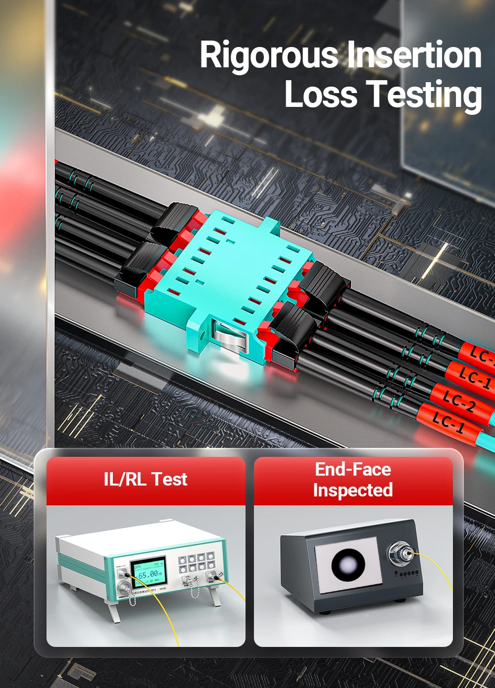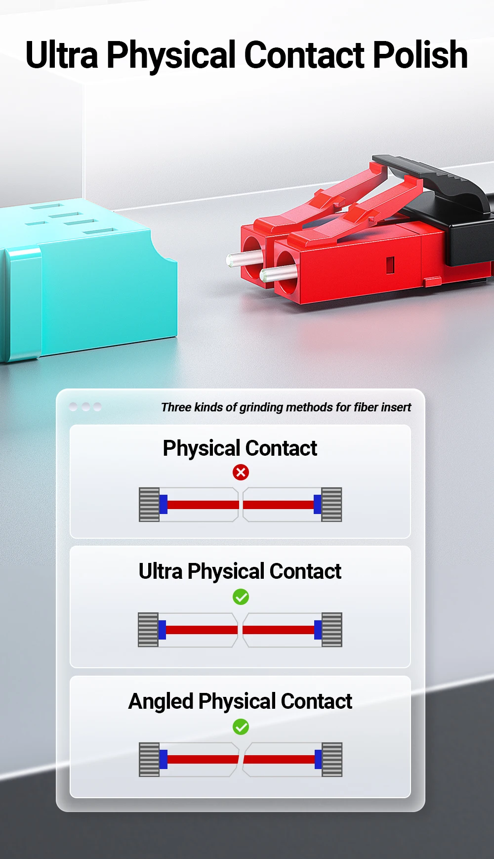 Rectificado preciso de la cara final del UPC para garantizar una transmisión de datos estable. Pérdida de inserción ≤ 0.2dB, pérdidas de retorno ≥ 50dB