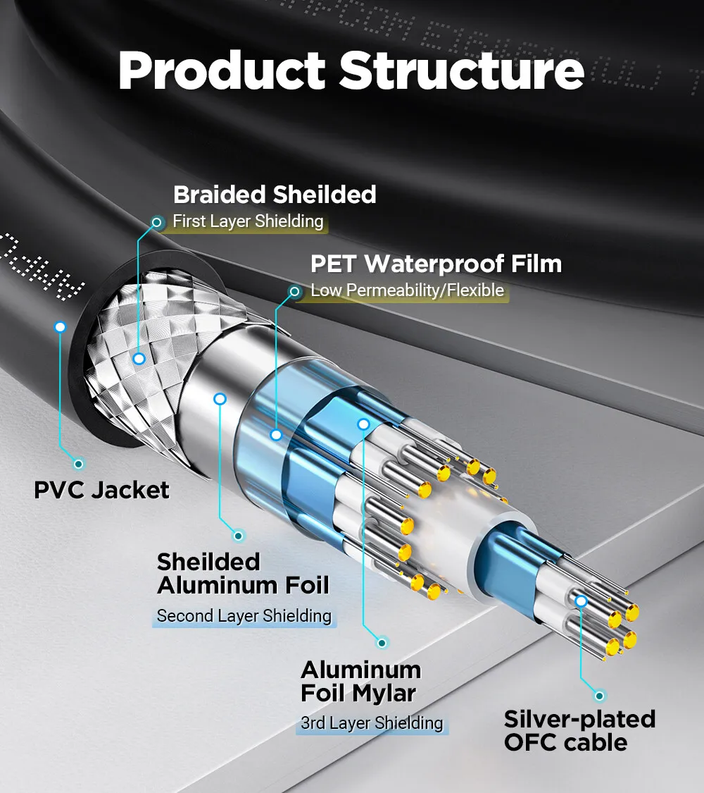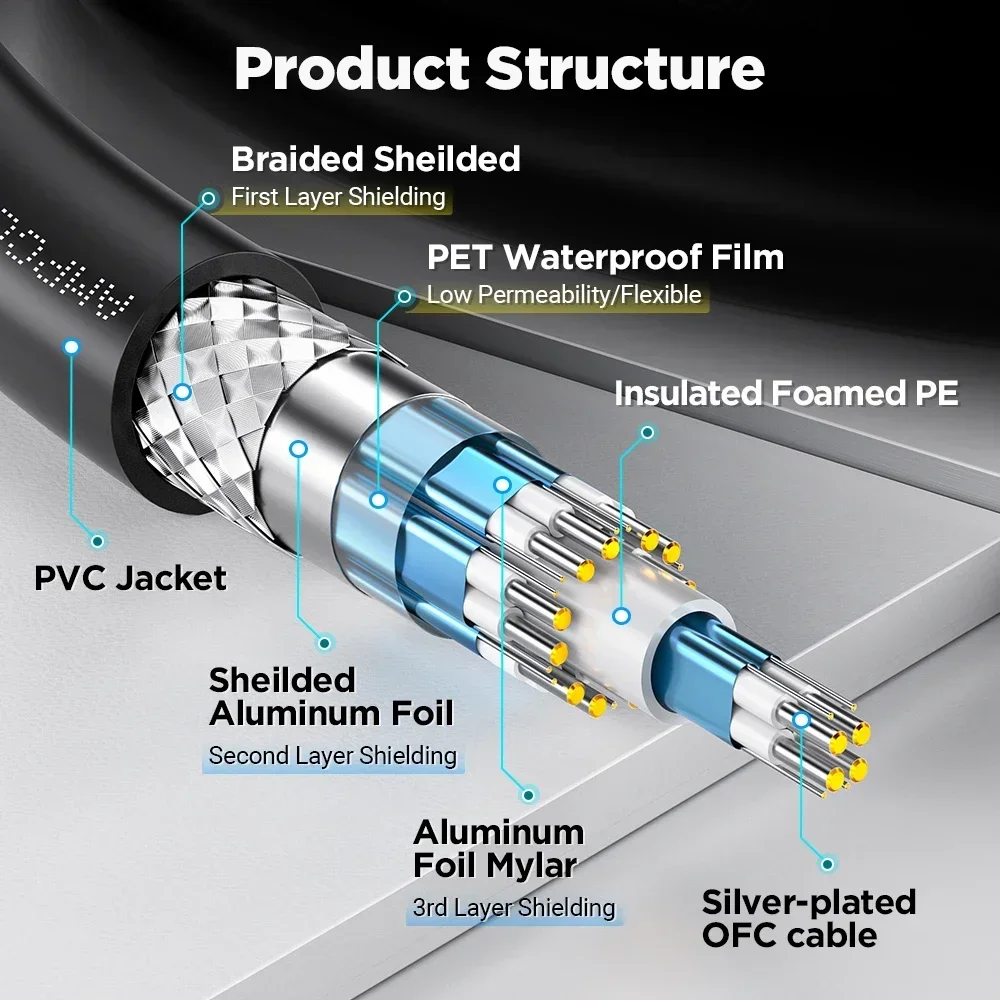El cable AMPCOM DAC utiliza un cable de cobre plateado sin oxígeno y múltiples capas de blindaje que garantizan un rendimiento de transmisión estable.