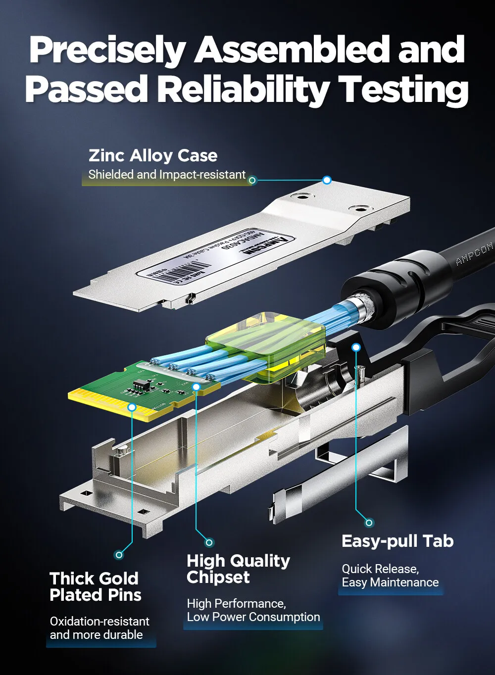 Los conjuntos de cables de cobre AMPCOM QSFP + son soluciones de E/S rentables y de alto rendimiento para aplicaciones Ethernet de 40Gb. Permite a los fabricantes de hardware lograr una alta densidad de puertos, configurabilidad y utilización a un costo muy bajo y reducir el presupuesto de energía. Los conjuntos de cables de alta velocidad cumplen y superan los requisitos de rendimiento y fiabilidad estipulados por Gigabit Ethernet y el estándar de la industria de canal de fibra.