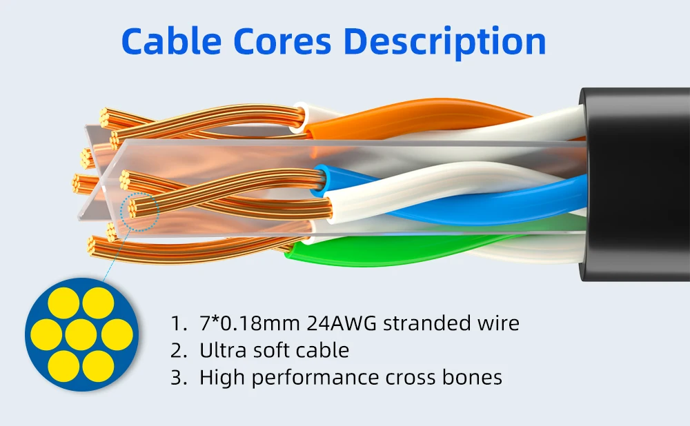 Conductores de cobre sin oxígeno trenzados UTP 24AWG para mayor flexibilidad, retorcidos apretados en pares y anidados en una ranura para minimizar la diafonía, para transferencia de datos de alta velocidad y resistencia a la corrosión