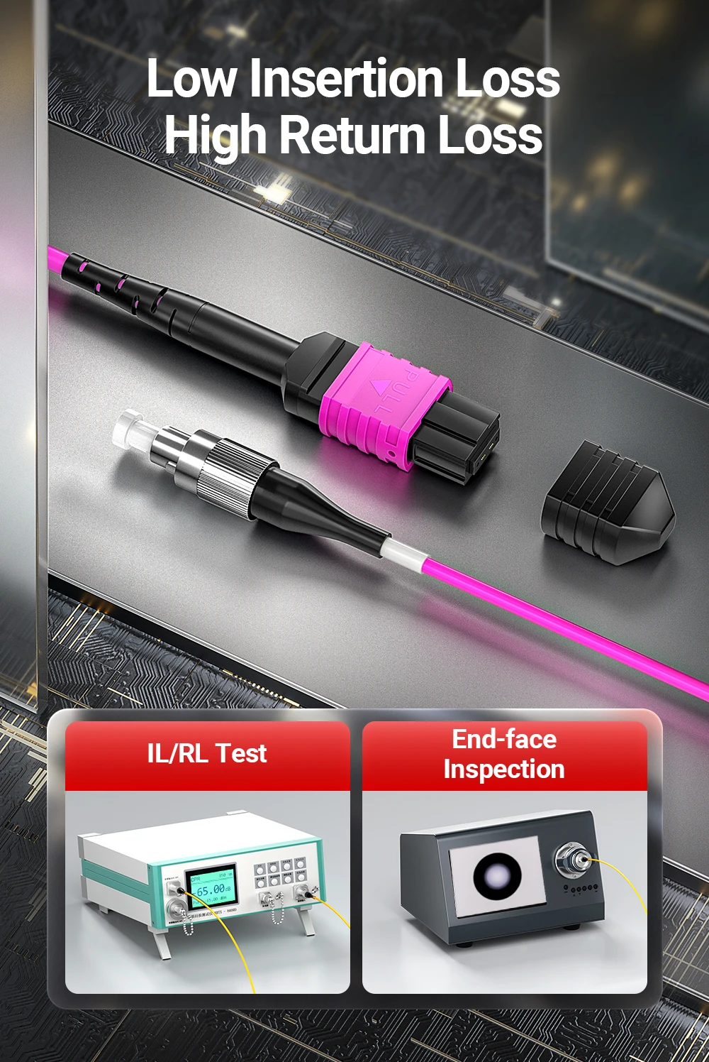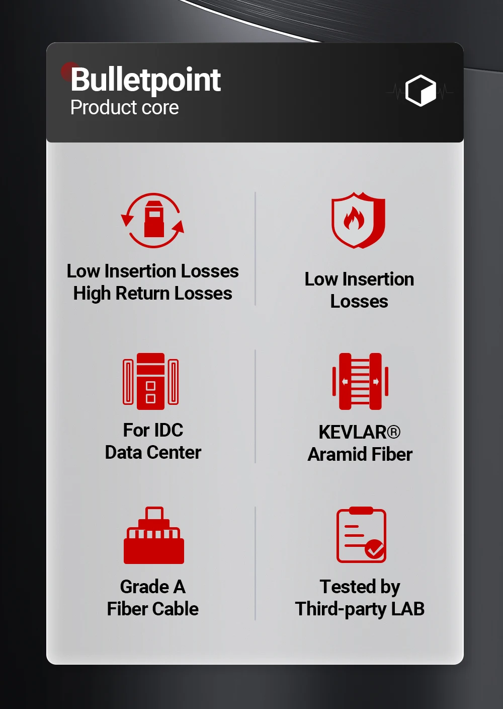 Pérdidas de inserción bajas Pérdidas de alto retorno/Pérdidas de inserción bajas/Para centro de datos IDC/Fibra de aramida KEVLSR®/Cable de fibra de grado A/Probado por LAB de terceros