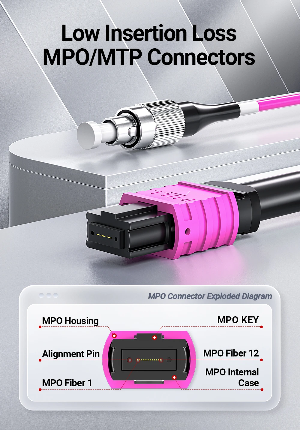 El cable MPO de AMPCOM es un cable troncal MPO 9/125 (monomodo) o 50/125 (multimodo) preterminado de fábrica, que ofrece al usuario la ventaja de una calidad constante, una instalación mucho más rápida, y gestión de cables más sencilla. El cable troncal de fibra óptica MPO está fabricado con múltiples conectores hembra Senko MPO de 8 y 12 hilos y cables de fibra óptica optimizados para láser de 8,12 núcleos (fibra Corning ClearCurve®). Este cable troncal MPO se ajusta a la polaridad tipo B (conexión cruzada), y el conector MTP® está disponible bajo petición. Este cable troncal de fibra MPO es adecuado para usar en 1G SFP SR4, 10G SFP + SR4, 40G QSFP + SR4, 40G QSFP + SR4, 40G QSFP + eSR4, y conexión óptica de transceptor 100G QSFP28 SR4.