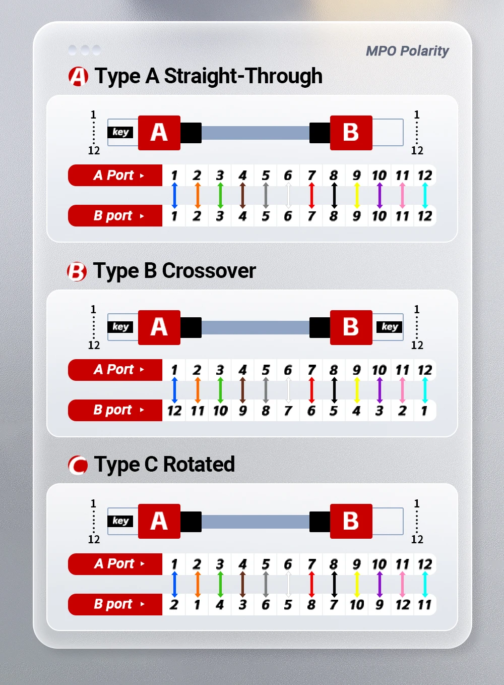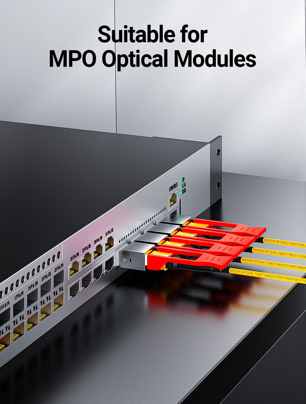 El cable MPO de AMPCOM es un cable troncal MPO 9/125 (monomodo) o 50/125 (multimodo) preterminado de fábrica, que ofrece al usuario la ventaja de una calidad constante, una instalación mucho más rápida, y gestión de cables más sencilla. El cable troncal de fibra óptica MPO está fabricado con múltiples conectores hembra Senko MPO de 8 y 12,24 hilos y cables de fibra óptica optimizados para láser de 8,12 y 24 núcleos (fibra Corning ClearCurve®). Este cable troncal MPO se ajusta a la polaridad tipo B (conexión cruzada), y el conector MTP® está disponible bajo petición. Este cable troncal de fibra MPO es adecuado para usar en 1G SFP SR4, 10G SFP + SR4, 40G QSFP + SR4, 40G QSFP + SR4, 40G QSFP + eSR4, y conexión óptica de transceptor 100G QSFP28 SR4.