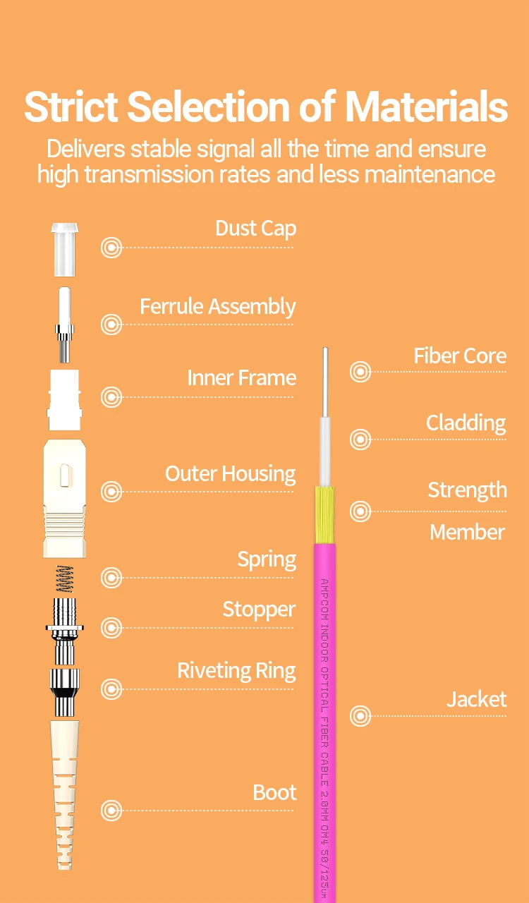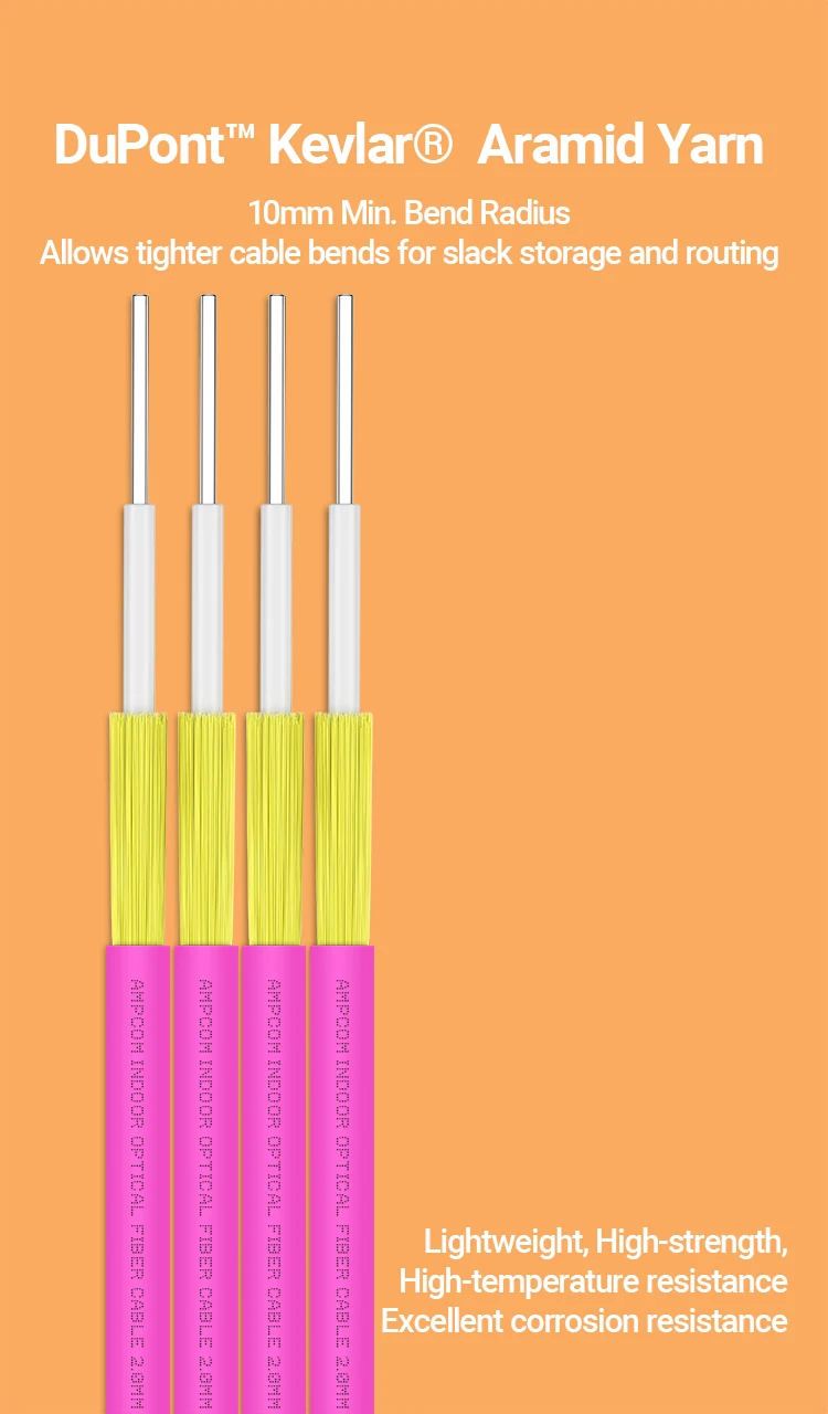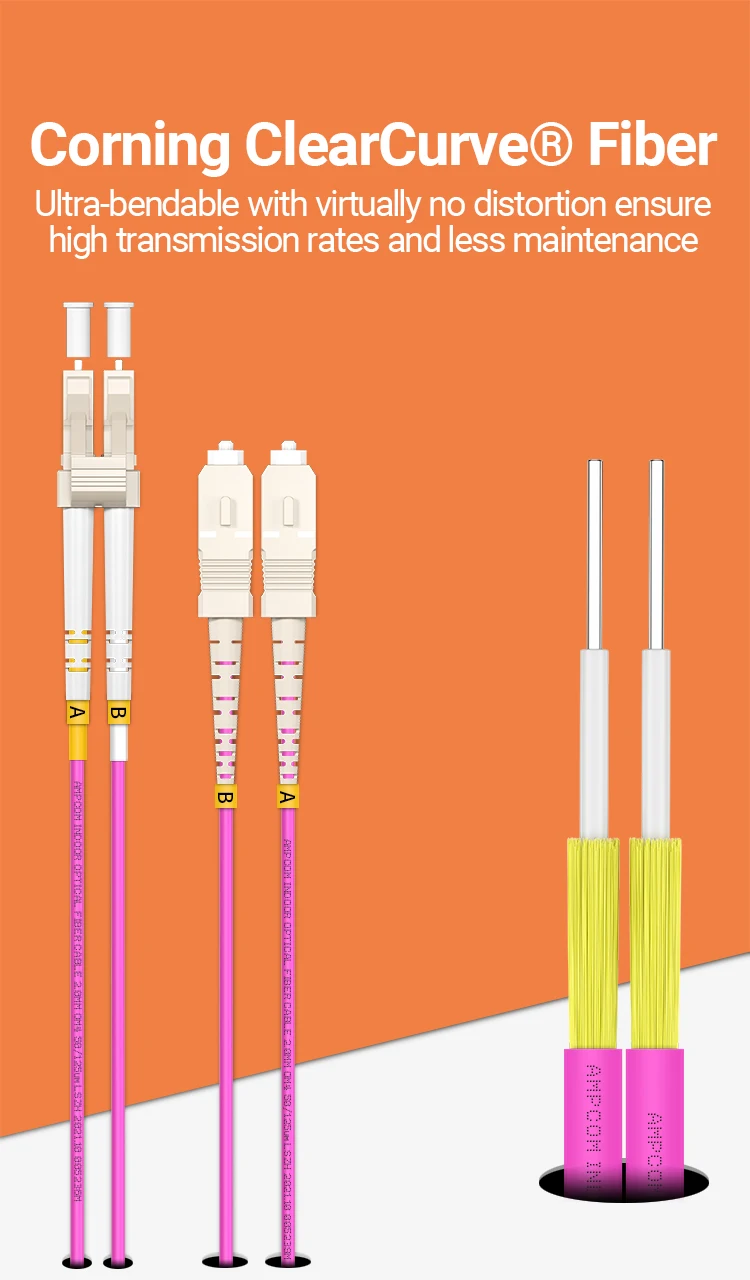 El cable de fibra óptica multimodo OM4 de 50/125μm insensible a la curvatura tiene menos atenuación cuando se dobla o tuerce en comparación con los cables de fibra óptica tradicionales, lo que hará que la instalación y el mantenimiento de los cables de fibra óptica sea más eficiente. También puede ahorrar más espacio para su cableado de alta densidad en centros de datos, redes empresariales, salas de telecomunicaciones, granjas de servidores, redes de almacenamiento en la nube y cualquier lugar donde se necesiten cables de conexión de fibra.