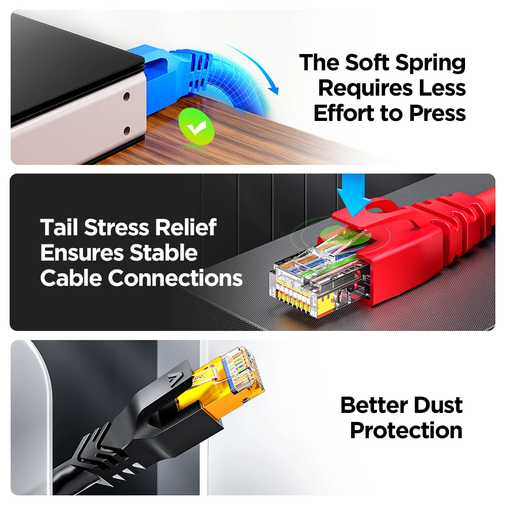Funcionó perfectamente con AMPCOM y otras marcas de conectores pas-through. Pros No es muy rígido, permite que el conector se retire sin mucho esfuerzo. Encaja perfectamente en conectores CAT6 y CAT5e. Contr - Ninguno. Buena calidad y buen precio.