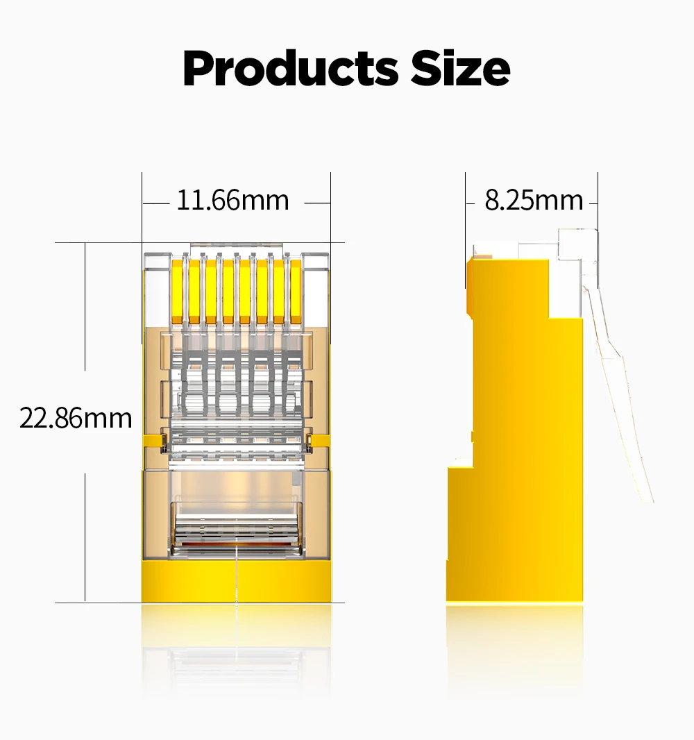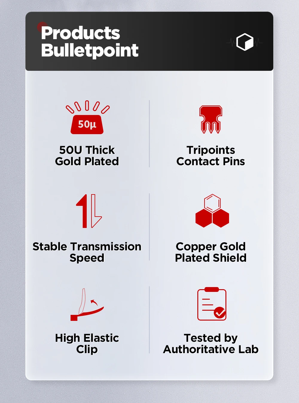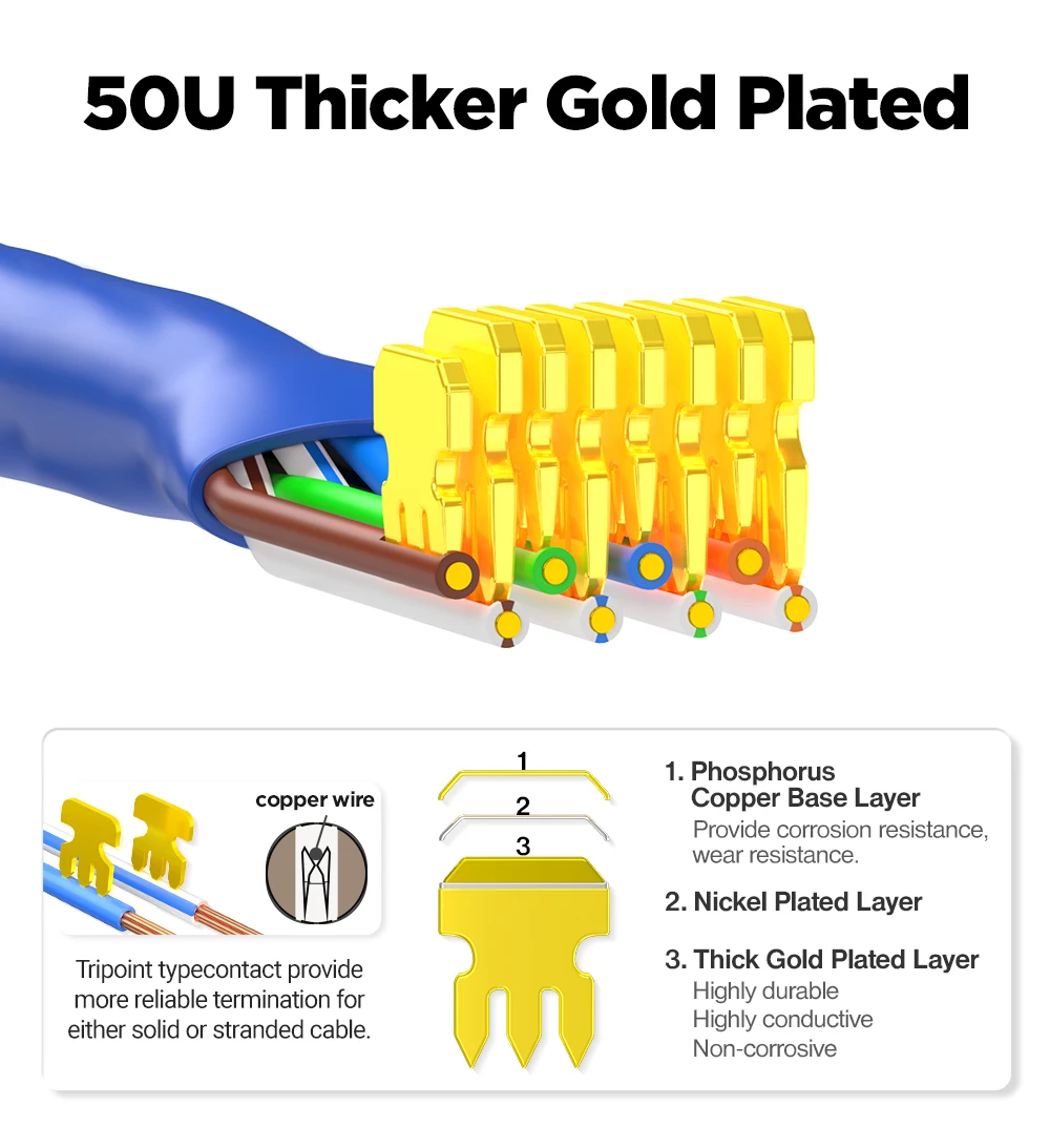 •Uso sin preocupaciones: los contactos chapados en oro de 50u mantienen una transmisión de datos superior y confiable al evitar que la corrosión dure con el tiempo; La carcasa de policarbonato transparente resistente a los impactos es duradera para el engarzado.El clip de bloqueo del conector se puede doblar muchas veces sin romperse.