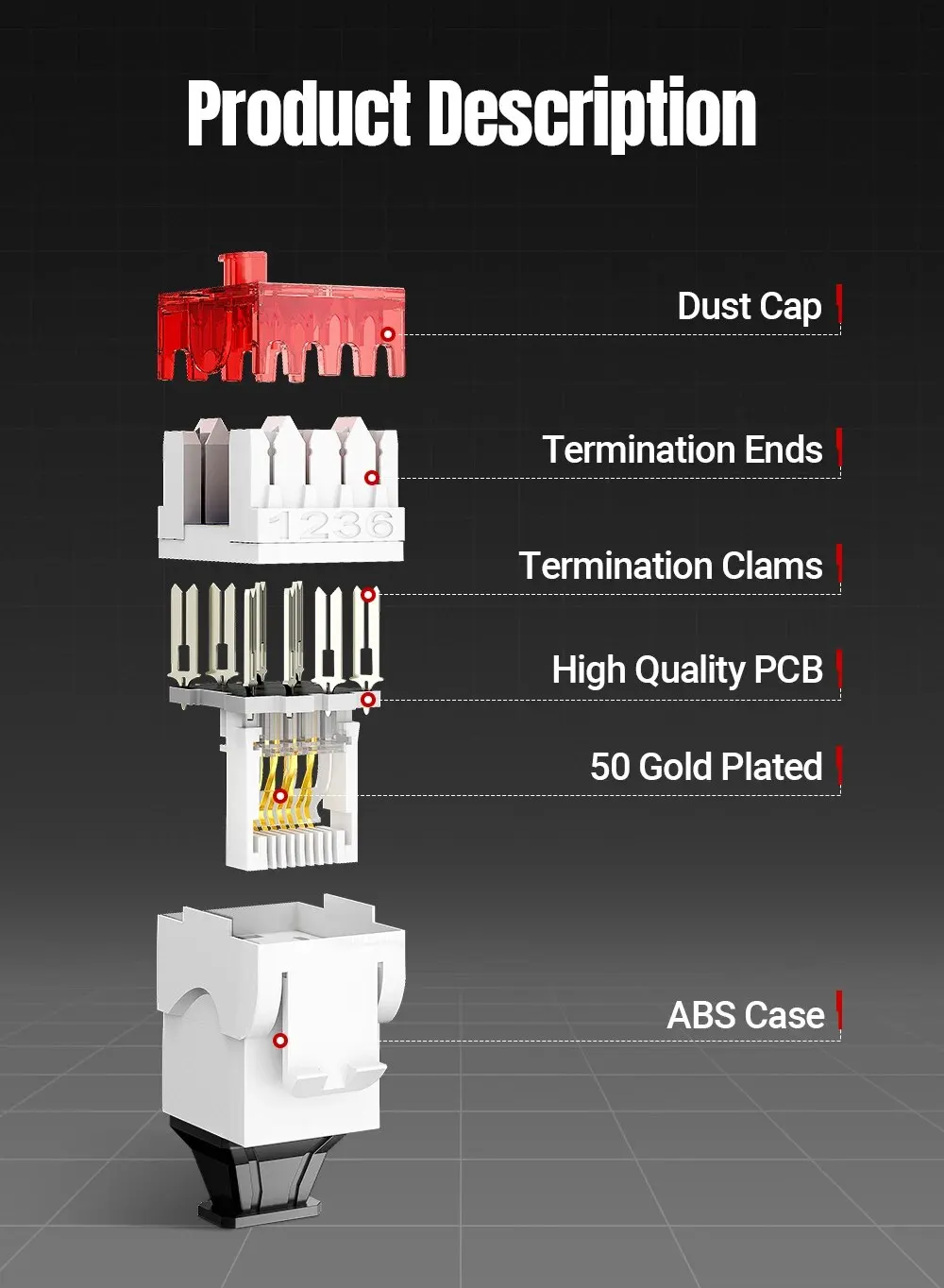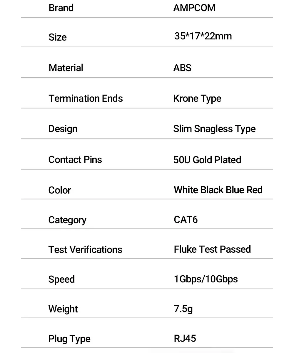 Admite cable CAT5E/6 estándarCompatible con cables conductores de cobre sólidos y trenzados de 23 a 26 AWG