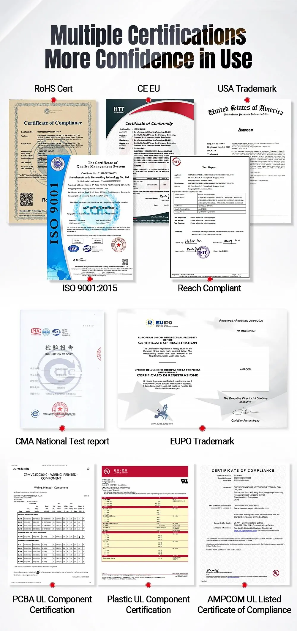 Elija sabiamente: siga los estándares de cableado (T568A o T568B).Utilice herramientas adecuadas: utilice las herramientas correctas para la instalación y las pruebas.Planifique el cableado con cuidado: cree un plan de cableado claro para conexiones eficientes y estables.Maneje con cuidado: Evite doblar o tensar demasiado los cables durante la instalación.Mantenimiento regular: inspeccione periódicamente y limpie las conexiones para evitar problemas.Prevención de EMI: mantenga el Keystone Jack alejado de fuentes de interferencia electromagnética.Documentación: Mantenga registros para referencia futura.La seguridad es lo primero: cumpla con las normas de seguridad durante la instalación y el mantenimiento.Nota: Los productos recibidos solo incluyen Keystone Jack, ¡todos los demás productos tienen fines de demostración!Múltiples certificaciones Más confianza en el uso
