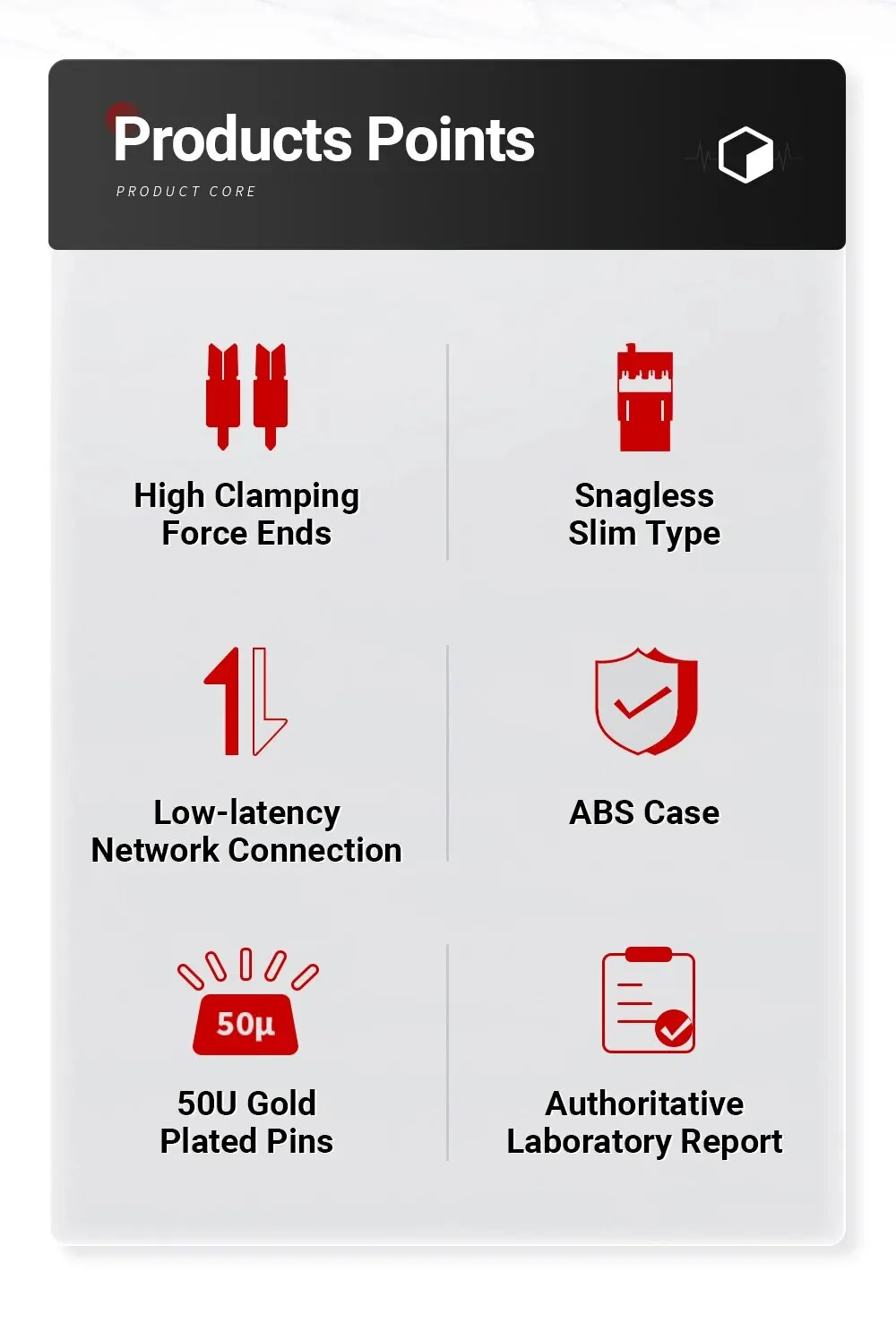 Extremos de alta fuerza de sujeción/Tipo delgado sin enganches/Conexión de red de baja latencia/Caja de ABS/Pasadores chapados en oro de 50U/Informe de laboratorio autorizado