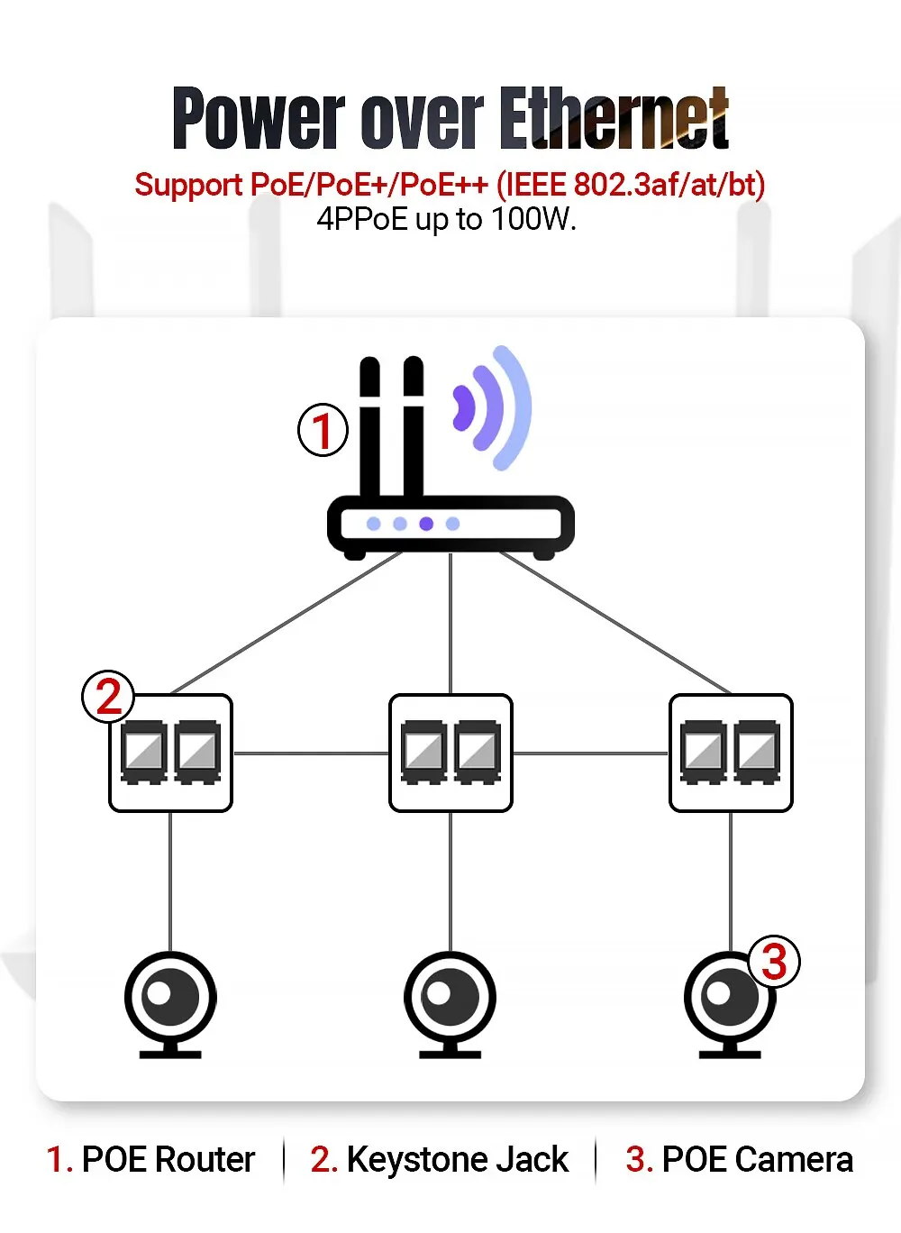 Alimentación a través de EthernetAdmite PoE/POE+/POE++ (IEEE 802.3af/at/bt) 4PPoE hasta 100W