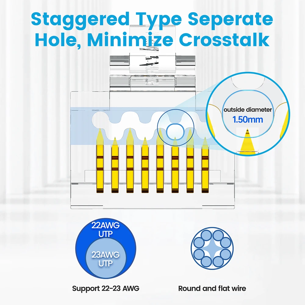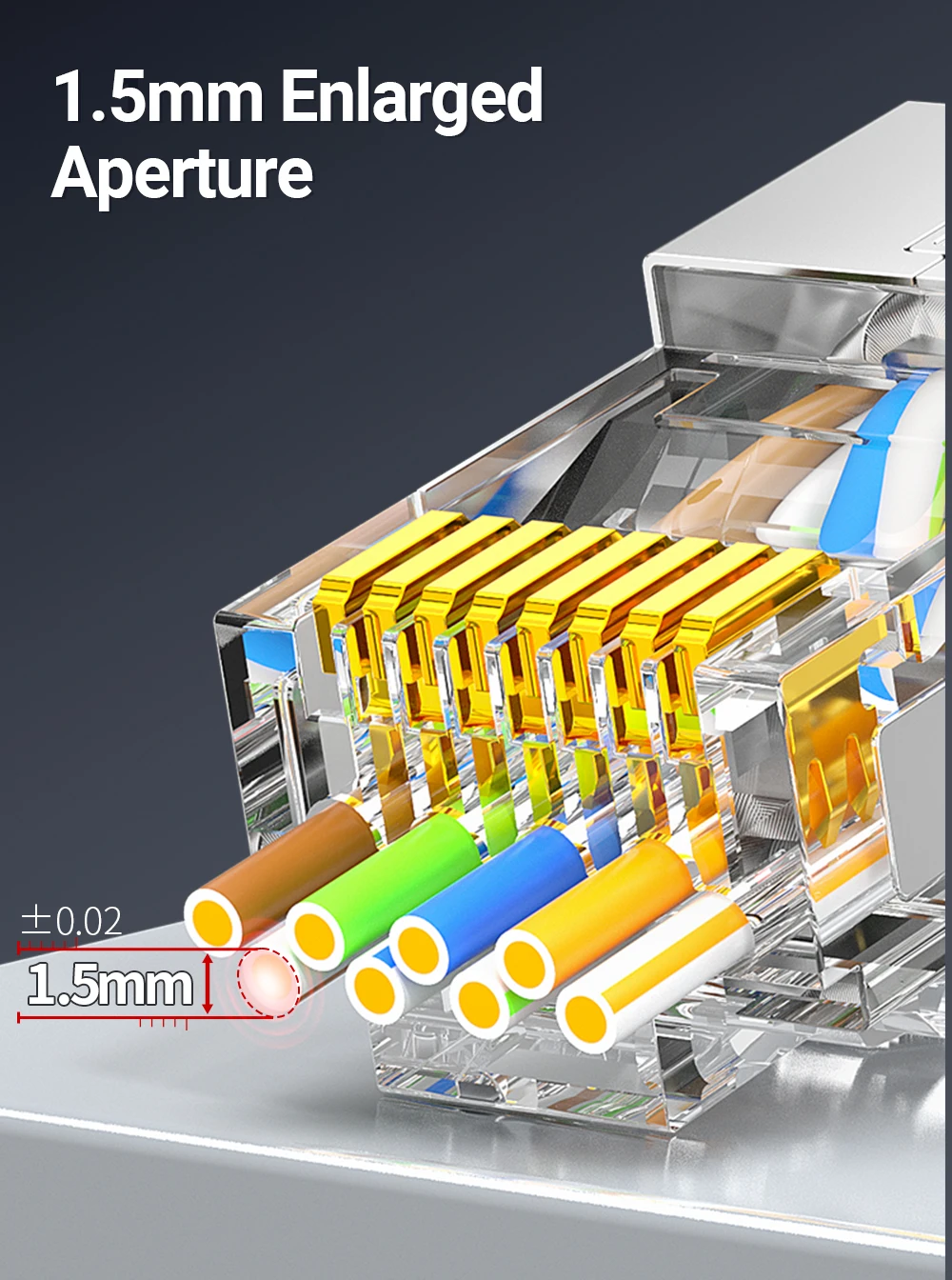 ✅Estos conectores modulares RJ45 están diseñados para trabajar específicamente con cables CAT6A y CAT7. El orificio máximo del conductor es de ⌀ 1,5 MM, admite tamaños de cable conductor de par trenzado individual de hasta 1,3mm ~ 1,45mm.