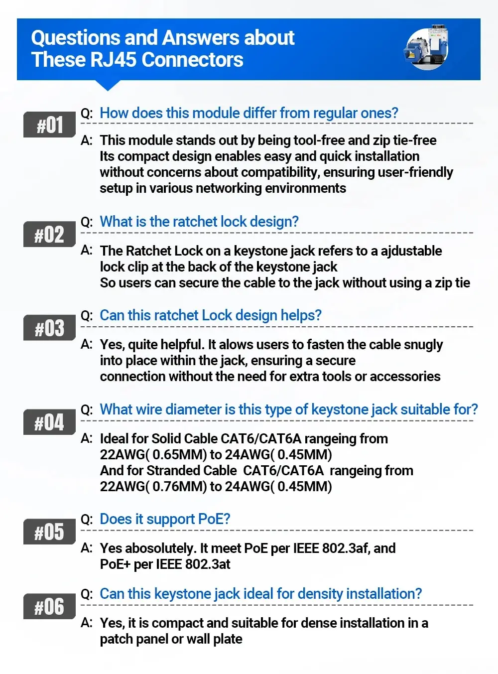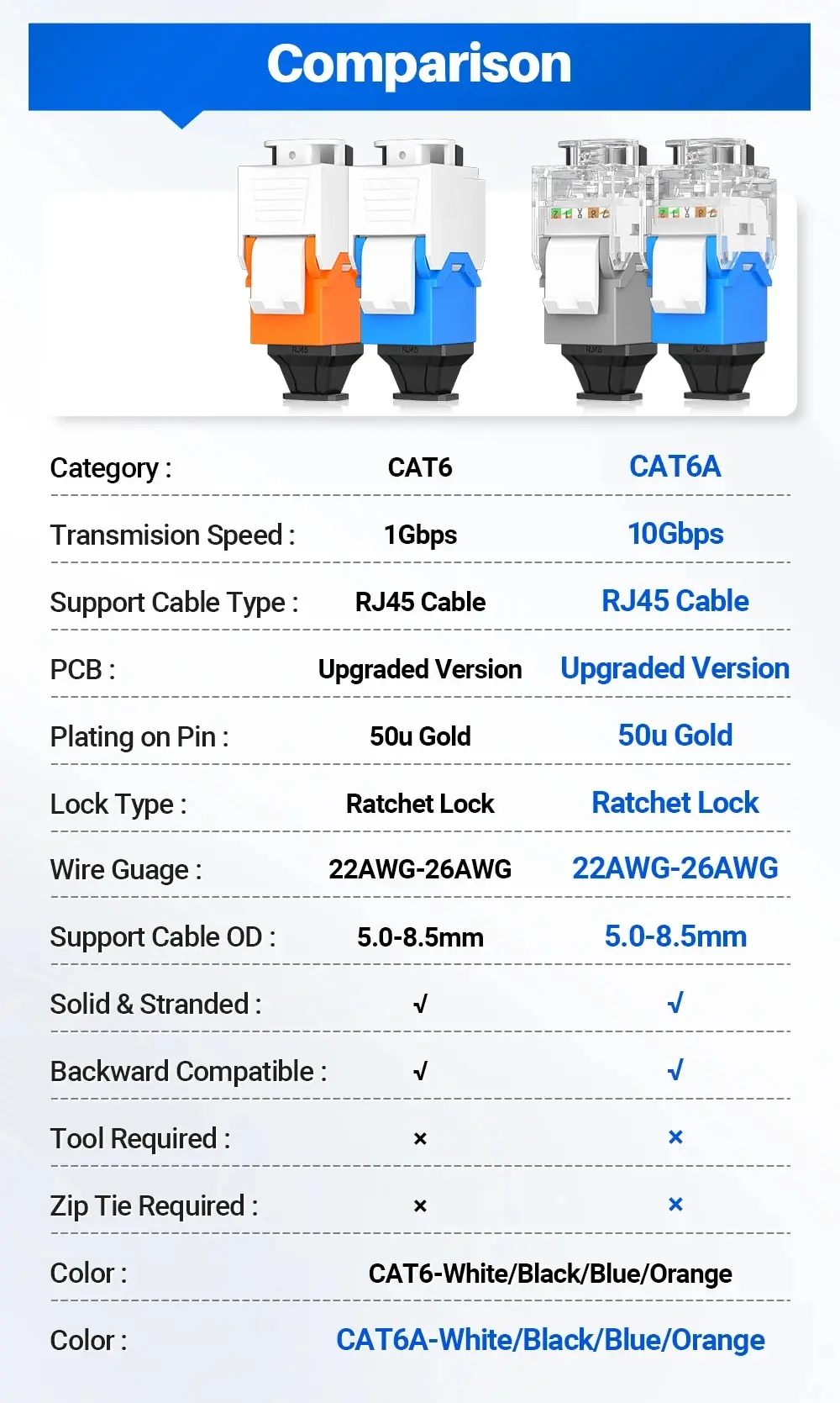 A: Ideal para el cable sólido CAT6/CAT6A rangeing de 22AWG (los 0,65 MM) a 24AWG (los 0,45 MM). Y para el cable trenzado CAT6/CAT6A rangeing de 22AWG (los 0,76 MM) a 24AWG (los 0,45 MM)