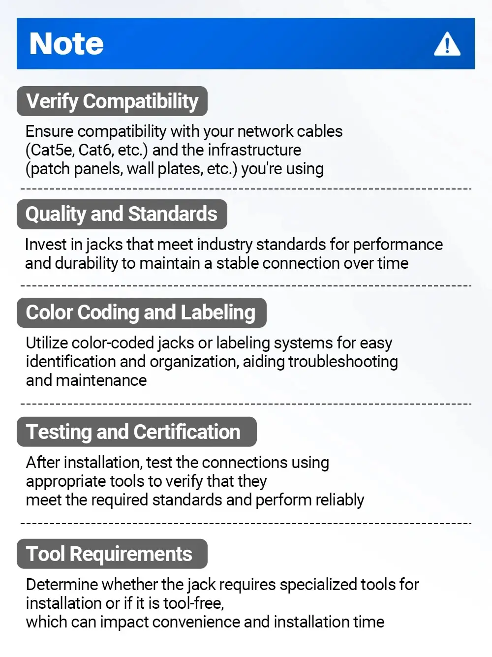 Verificar compatibilidad:Asegure la compatibilidad con sus cables de red (Cat5e, Cat6, etc.) y la infraestructura (paneles de conexión, placas de pared, etc.) que está utilizando.