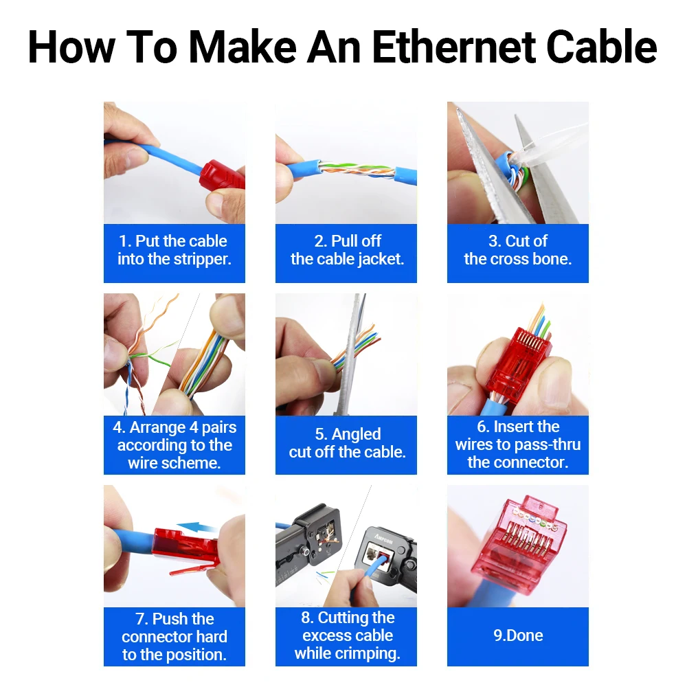 2. Identifica fácilmente el orden del cableado: la función de paso permite que los cables pasen por todo el enchufe para permitirle verificar que están en el orden correcto antes de engarzar el enchufe