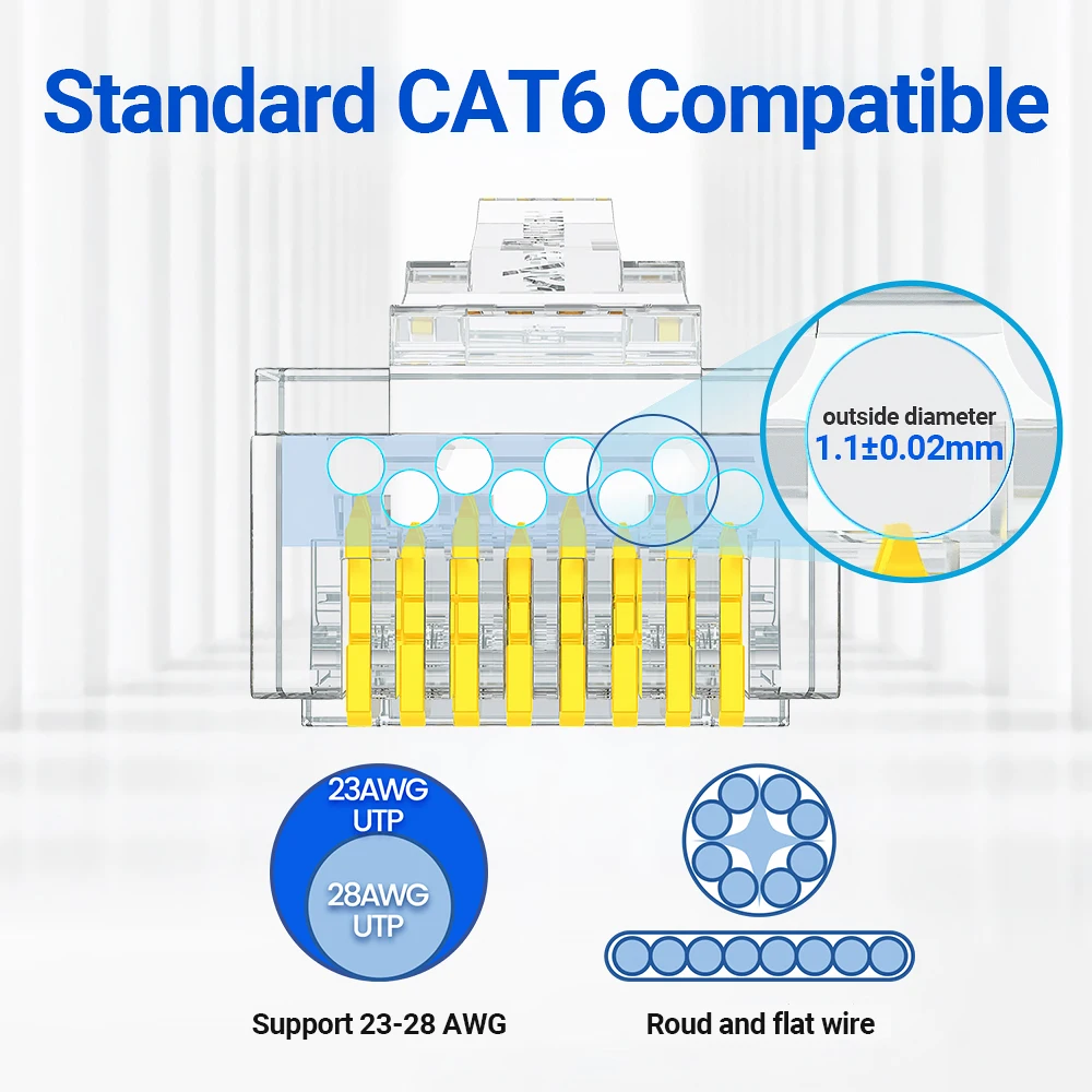 3. Compatibilidad Cate 6 clasificada para una red compatible con canales Gigabit Ethernet, estos conectores chapados en oro son compatibles con cables sólidos y trenzados, funcionan para todos los tipos de conectores Keystone y acoplador en línea Keystone RJ45, Y admite cable de red redondo o plano de 24 a 26 AWG, ¡CAT6 23awg solo es compatible con cable sólido!