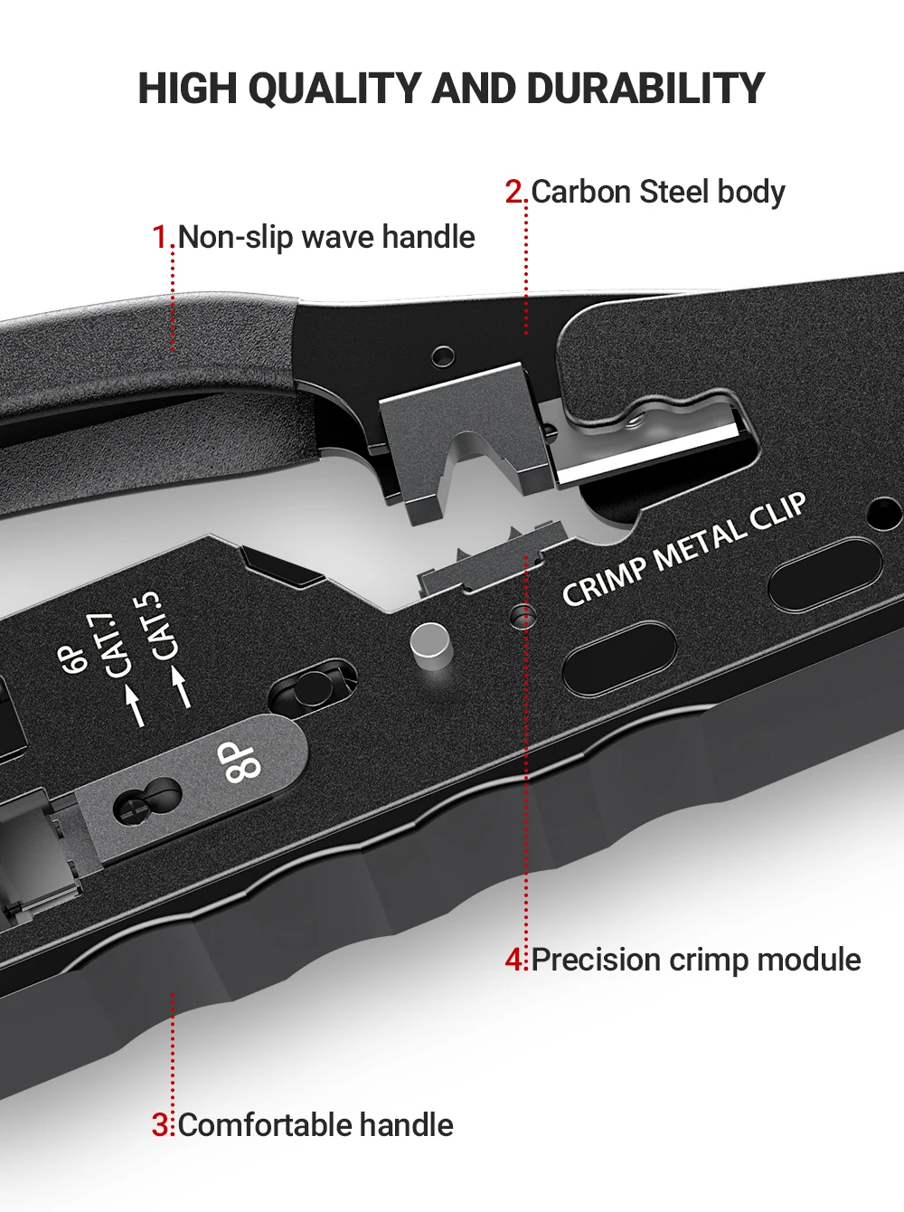 1. Herramienta de crimpado AMPCOM CAT7 EZ: le permite engarzar (CAT7, CAT6 CAT5/5E) y cables telefónicos, Compatible con todos los conectores de paso RJ45 CAT7 CAT6 CAT5E (incluidos los blindados), conectores de red RJ45, y conectores de teléfono RJ11/12