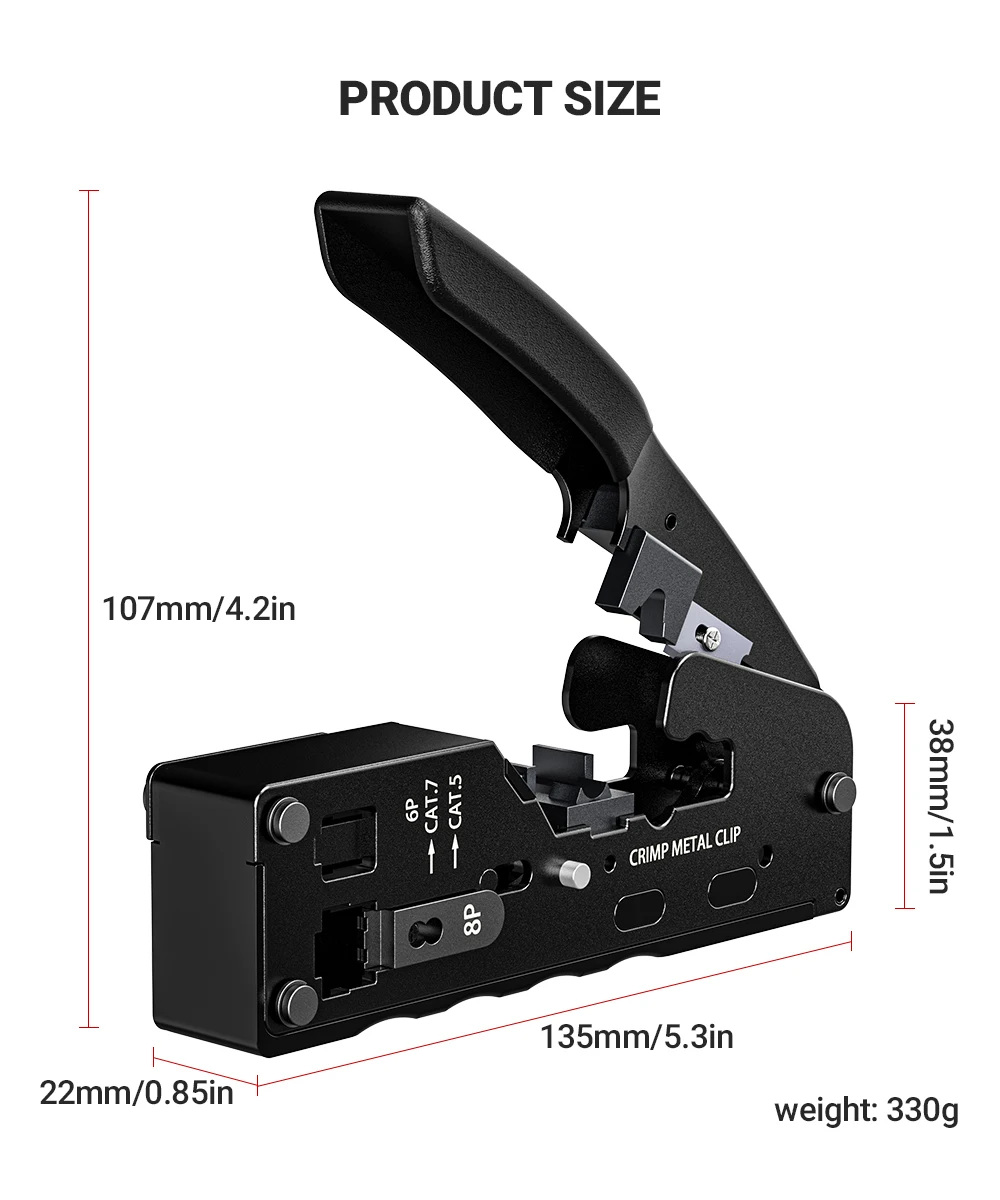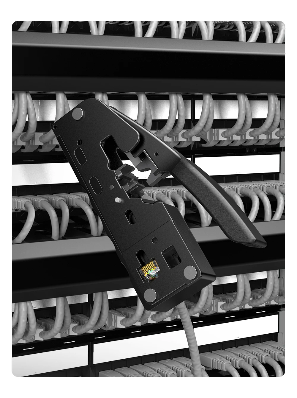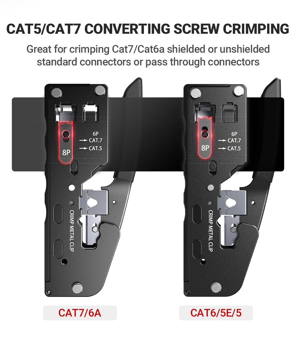 Ideal para engarzar conectores estándar blindados o sin blindaje Cat7/Cat6a/Cat6/Cat5e/Cat5 o conectores de paso