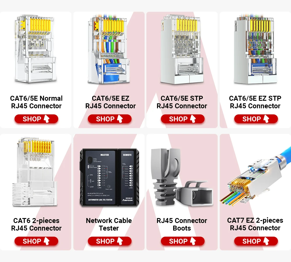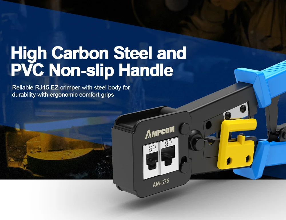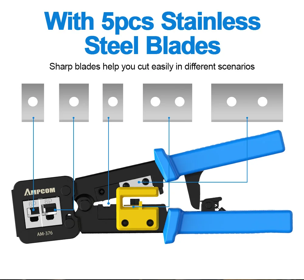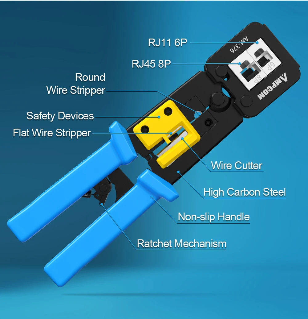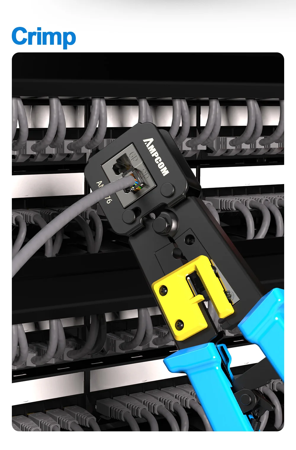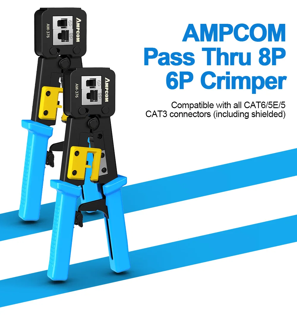 1. AMPCOM Multi-function EZ Crimp Tool: Lets you cut, strip and crimp (CAT6, CAT5/5e) and telephone cables, Compatible with all RJ45 CAT6 pass through connectors (including shielded), RJ45 CAT5E connectors, and RJ11/12 connectors