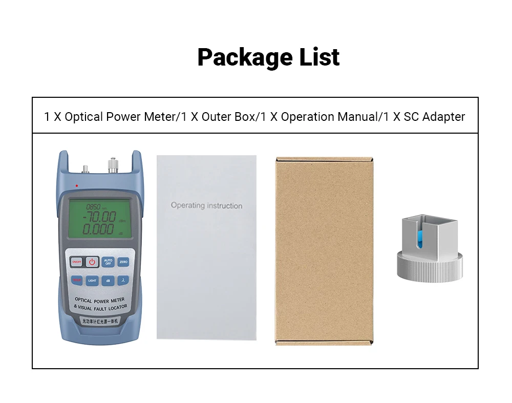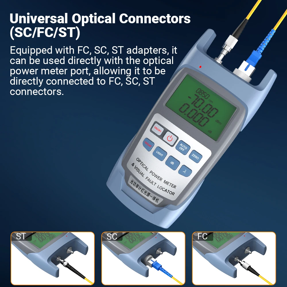 Equipado con adaptadores FC, SC y ST, se puede utilizar directamente con el puerto del medidor de potencia óptico, lo que permite conectarlo directamente a conectores FC, SC y ST.