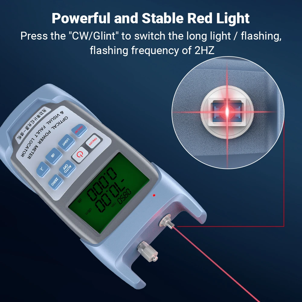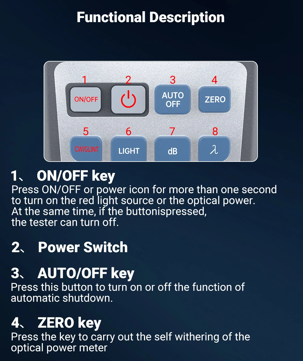 Pulsa el icono de encendido/apagado o encendido durante más de un segundo para encender la fuente de luz roja o la potencia óptica. Al mismo tiempo, si está abotonado, el Probador puede apagarse.