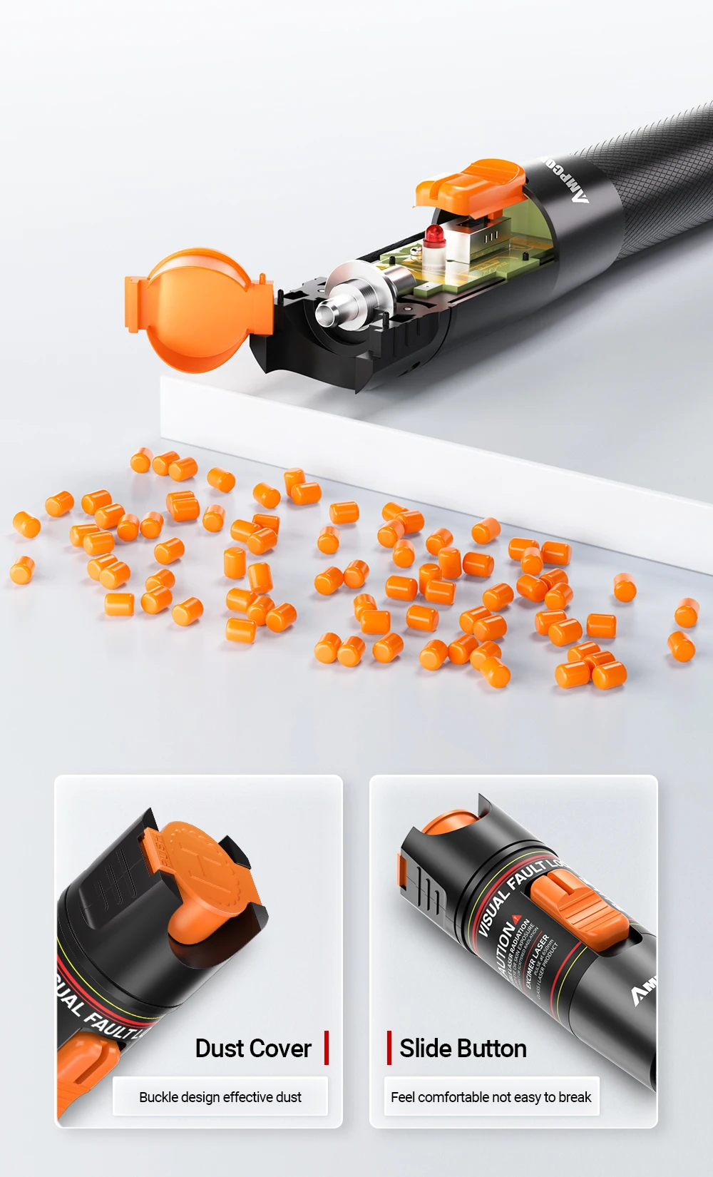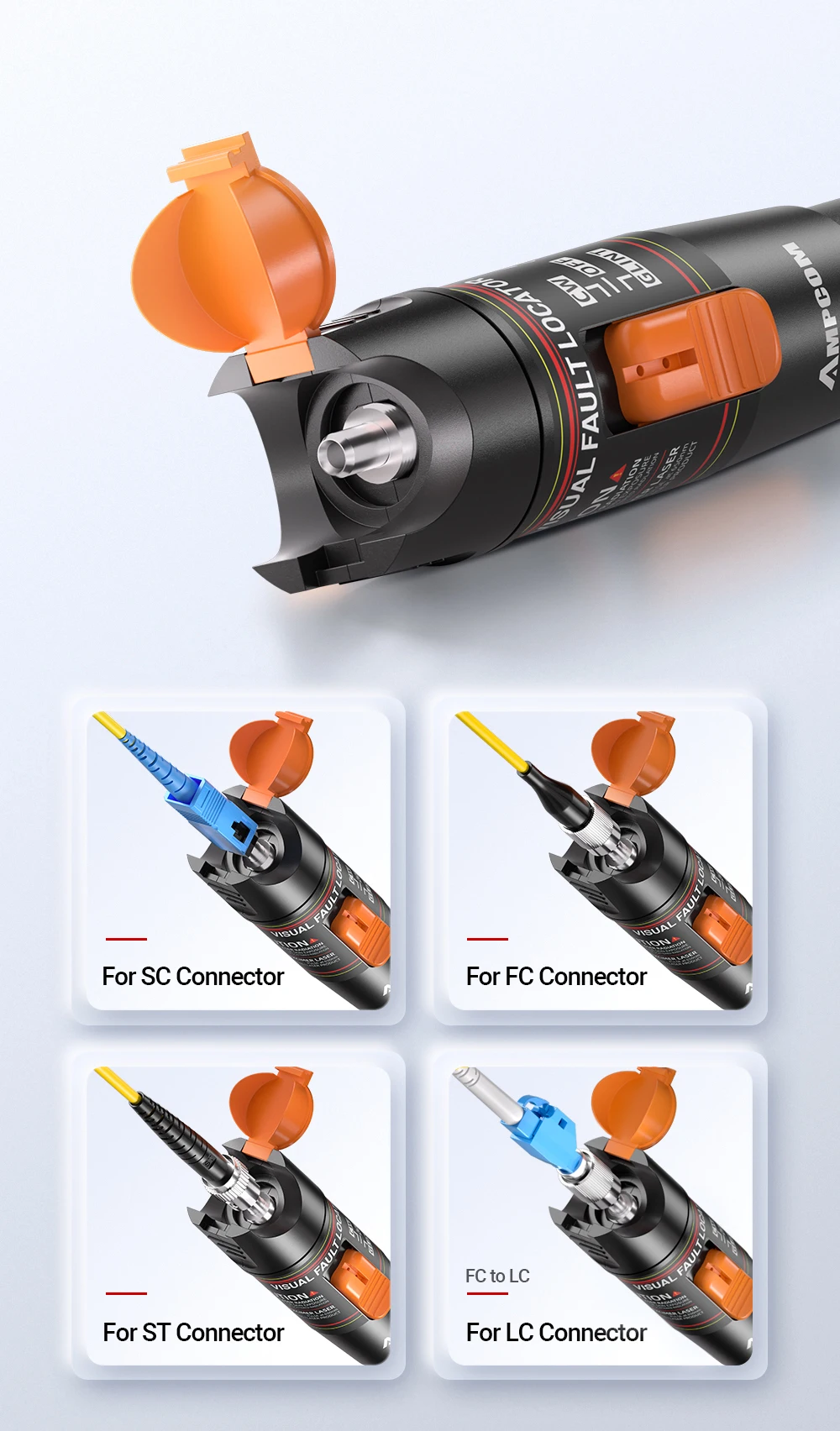 Este AMPCOM VFL puede detectar fallas hasta varios kilómetros de distancia, lo que los hace ideales para identificar problemas en redes de fibra óptica de larga distancia.