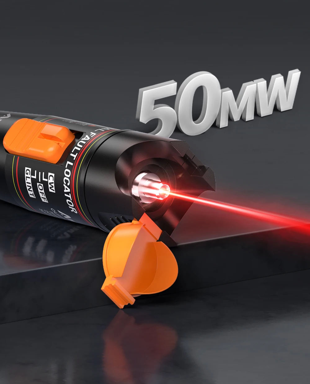 Cómo funciona VFL:La luz usada para transmitir señales sobre la fibra óptica está generalmente en la longitud de onda de 1300 a 1650nm que es invisible a los ojos desnudos. A Diferencia de OTDR que mide el tiempo de la incidencia y la amplitud de los pulsos reflejados enviados al cable de fibra óptica para localizar las fallas, VFL utiliza la luz visible potente en la longitud de onda 360 a 670nm que inyecta a una fibra para localizar visualmente y directamente las faltas en cable de fibra óptica. La luz visible viaja a lo largo del núcleo hasta que llega a una falla, donde se filtra. La luz que se filtra a través de la falla se puede ver a través del recubrimiento de plástico y las camisas bajo una iluminación adecuada.