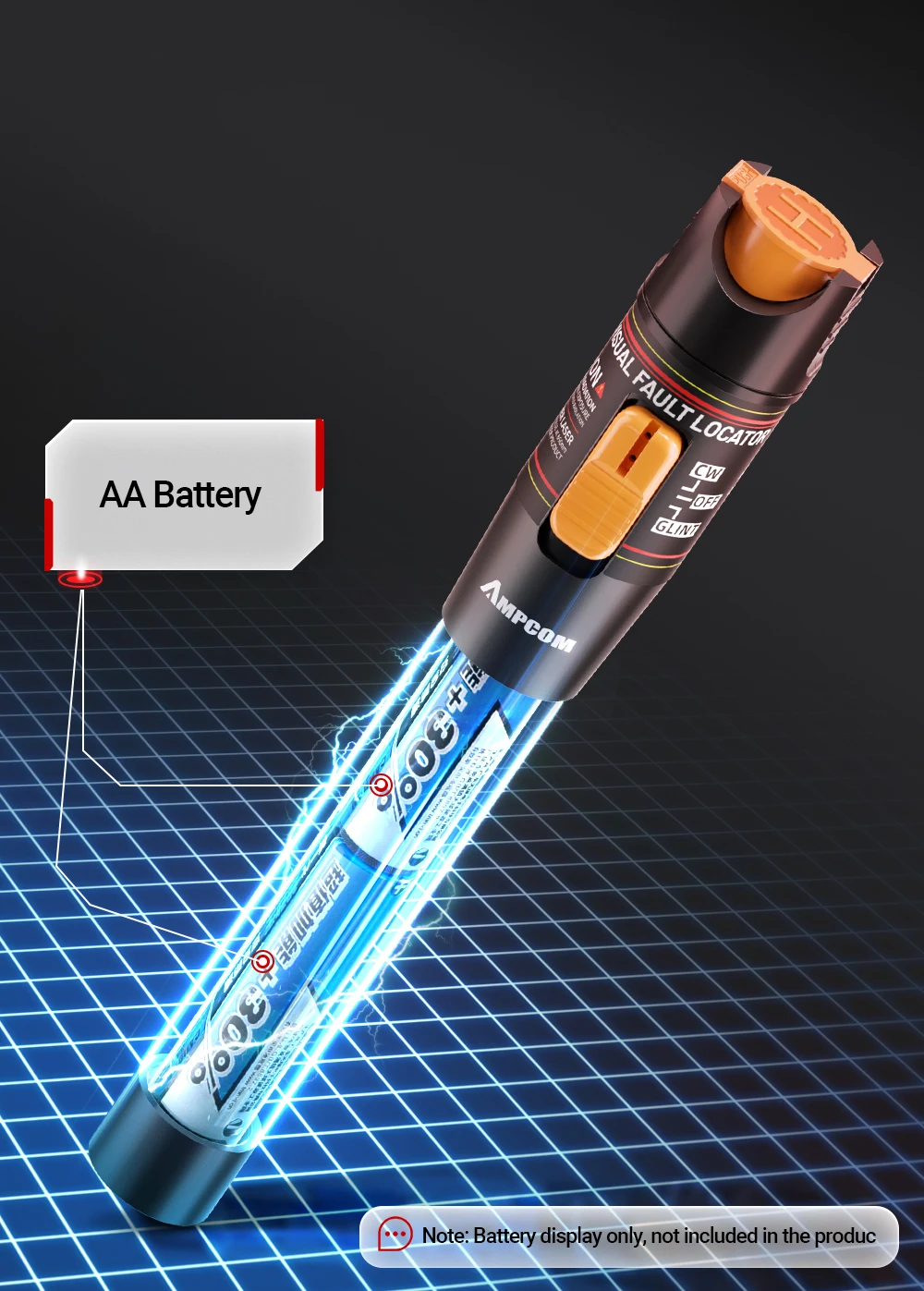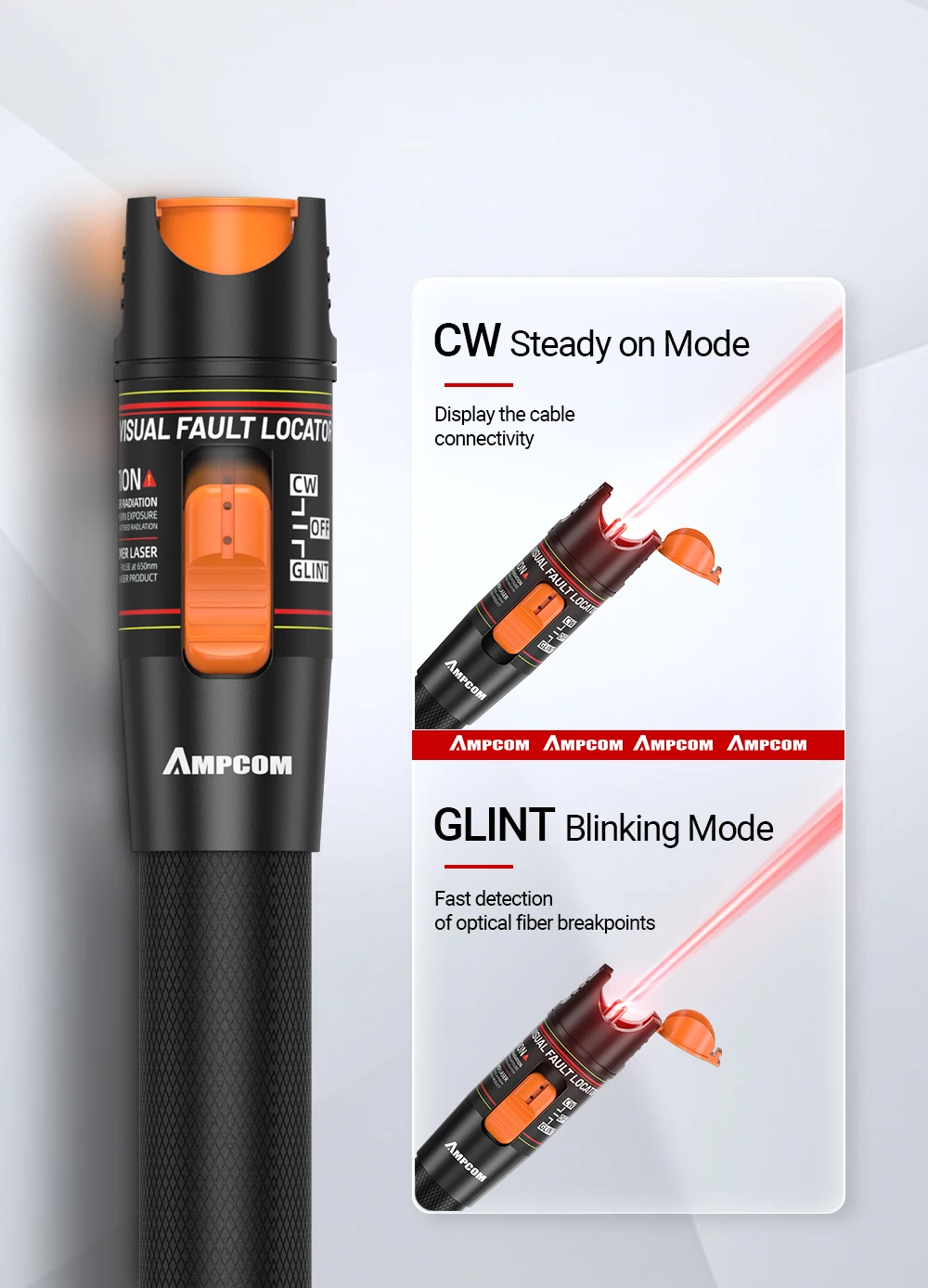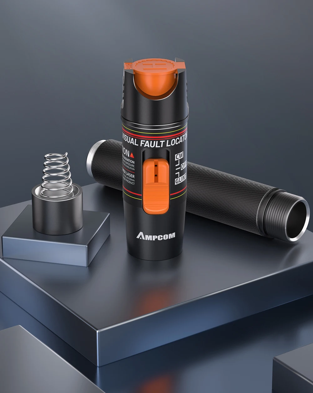 El Localizador Visual de fallos (VFL) de AMPCOM es un comprobador de fibra óptica compacto que utiliza un rayo láser para localizar roturas, curvas y otras fallas en los cables de fibra óptica.