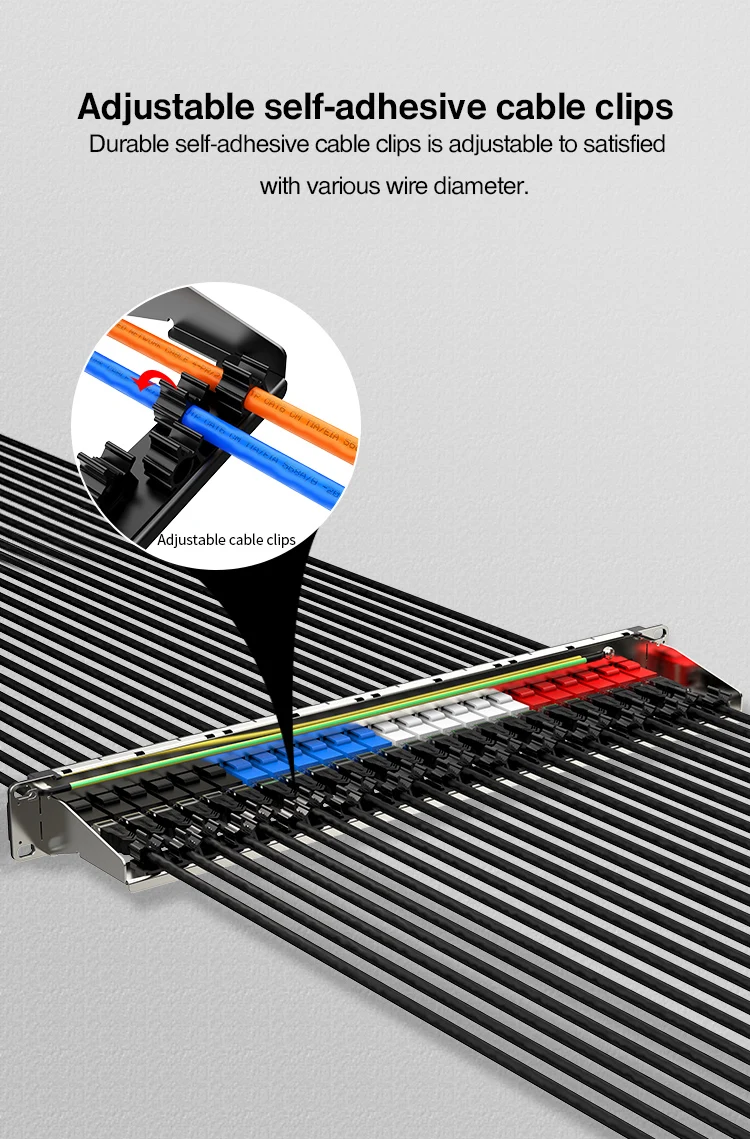 3.CABLE MANAGEMENT BAR with sequential port labels integrated into the panel provides easy identification of multiple types of cables; 24 C-shaped keyholes on the bar accommodate zip ties for securing cables on the keystone jack patch panel