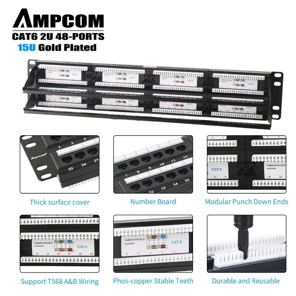 Comprar AMPCOM-Panel de parche CAT6 serie Premium, chapado en oro 15U, 2U, 48 puertos, montaje en pared