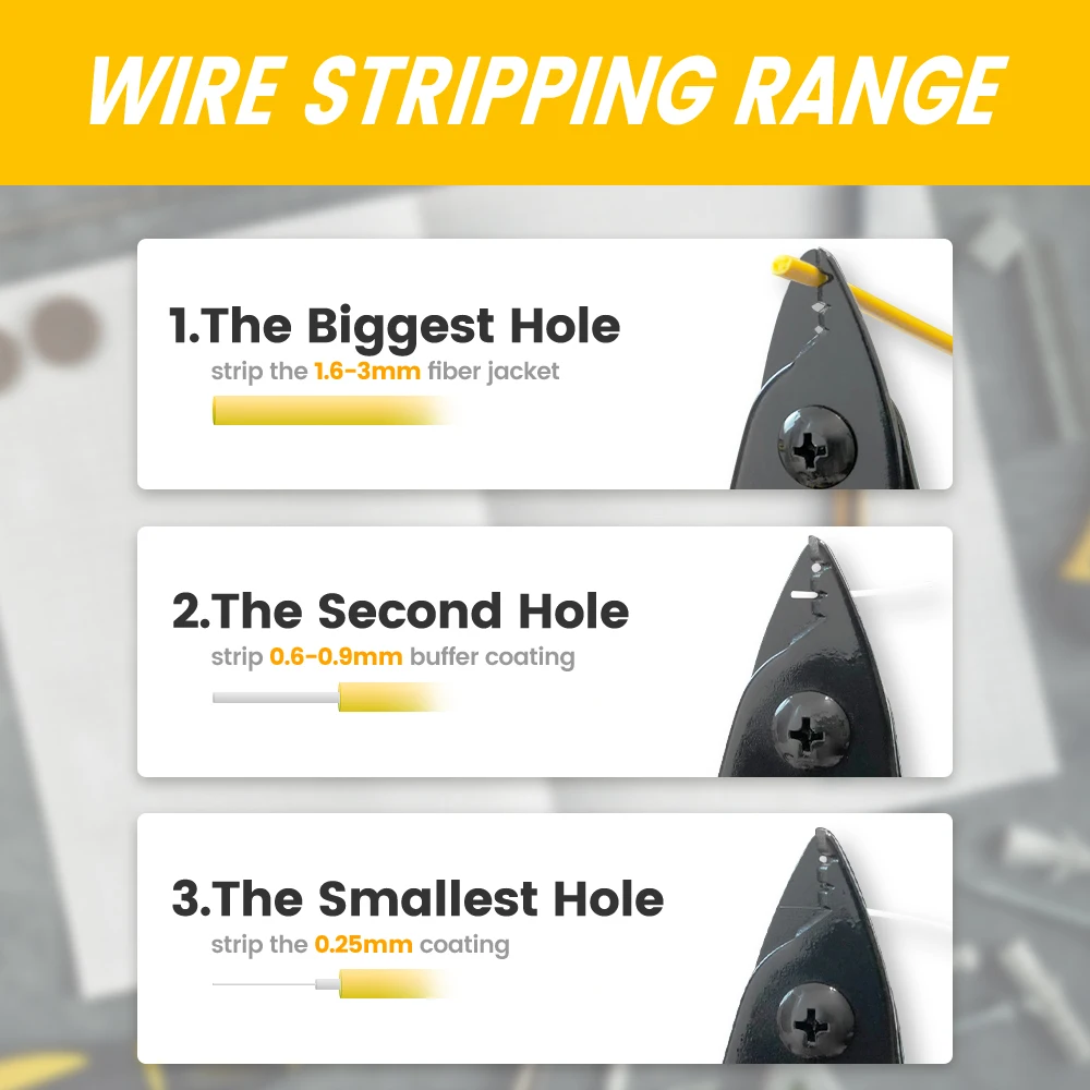 RANGOS DE PROFUNDIDAD DE CORTE DE 2 PUERTOS: Esta herramienta de pelado de cables fue construida para pelar fácilmente chaquetas de 1,6mm-3mm, amortiguadores apretados de 900 micras o recubrimiento amortiguador de 250 micras de los cables.