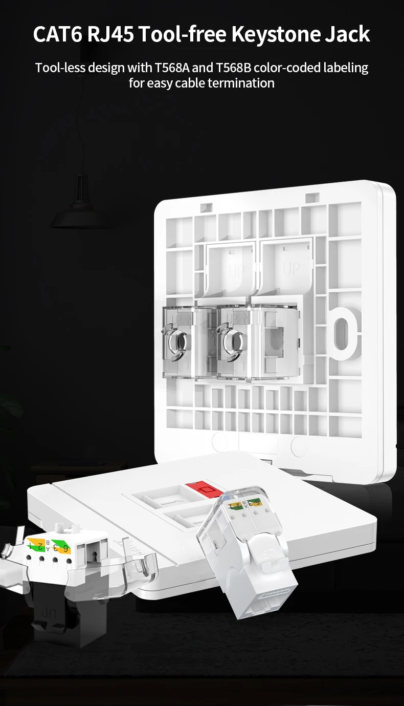 1. Autoterminable, no se requiere herramienta: este conector trapezoidal UTP CAT6 sin herramientas es un conector hembra RJ45 para redes; los conductores de cable se pueden terminar con una tapa de ajuste a presión de 180 grados, diseñada para encajar suavemente en la mayoría de las aplicaciones estándar de Keystone.
