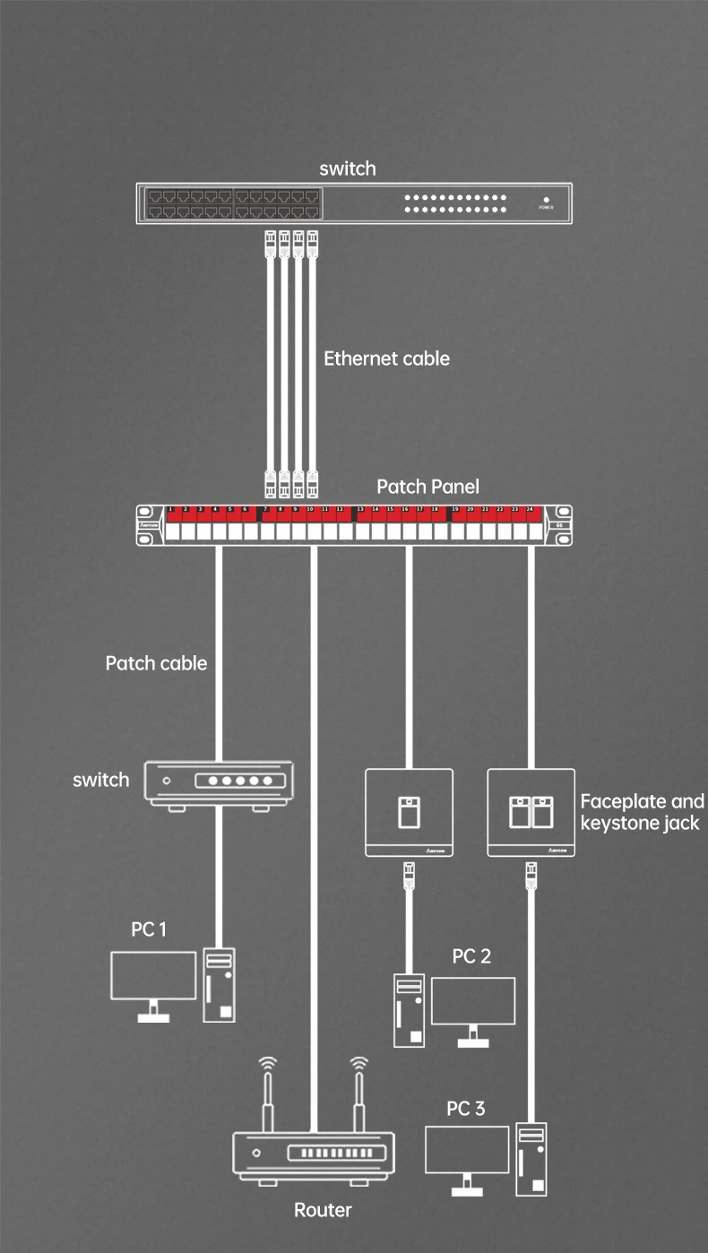 4. Aplicaciones: El conector es compatible con una amplia gama de paneles de conexión, cajas de montaje en superficie o placas de pared (placas frontales). Es bastante versátil y se puede montar con diferentes tipos de keystones en una misma placa.