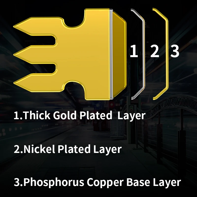 3 capas · Dientes de contacto tripuntos chapados en oro
