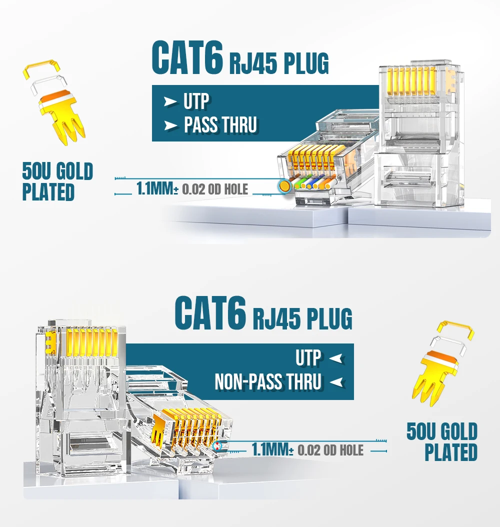 Enchufe CAT6 RJ45 chapado en oro de 50U × 10 unidades;