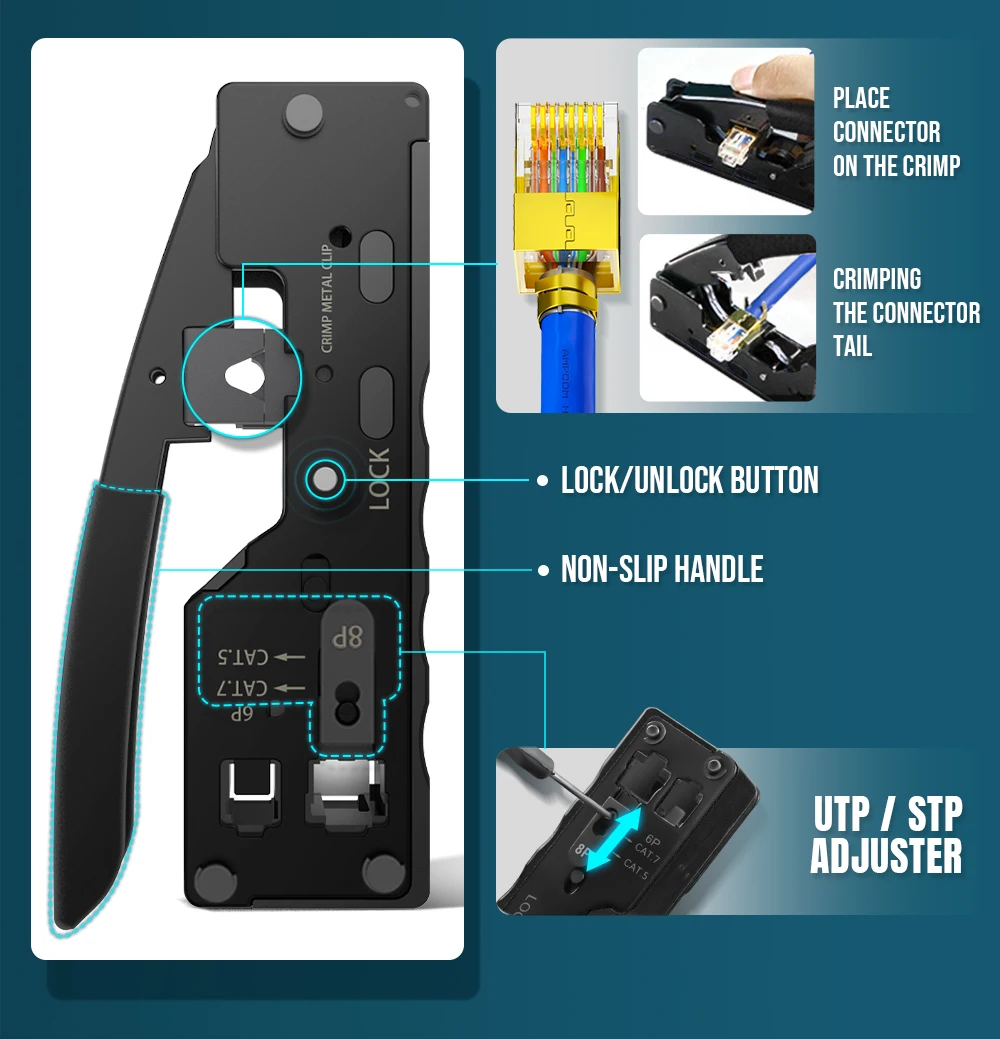 Admite conector UTP y STP, kit de herramientas de red para CAT8, CAT7A, CAT7, CAT6A, CAT6, CAT5E