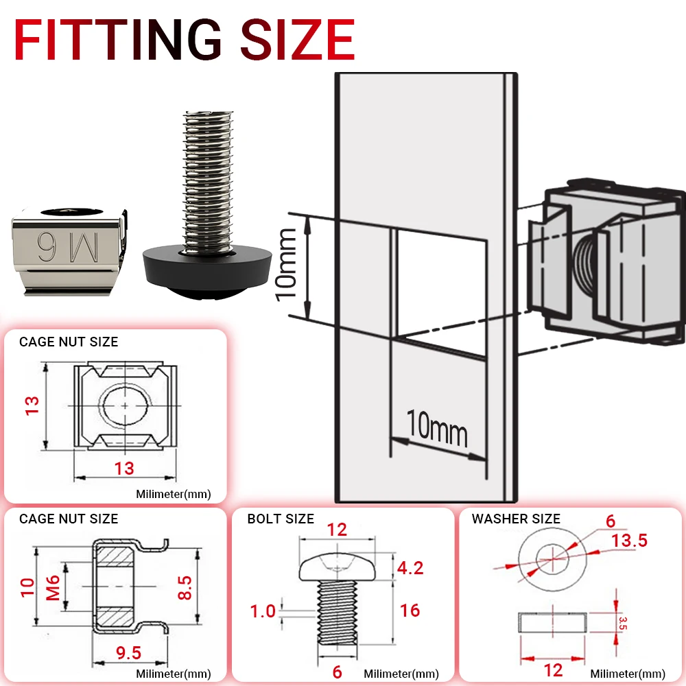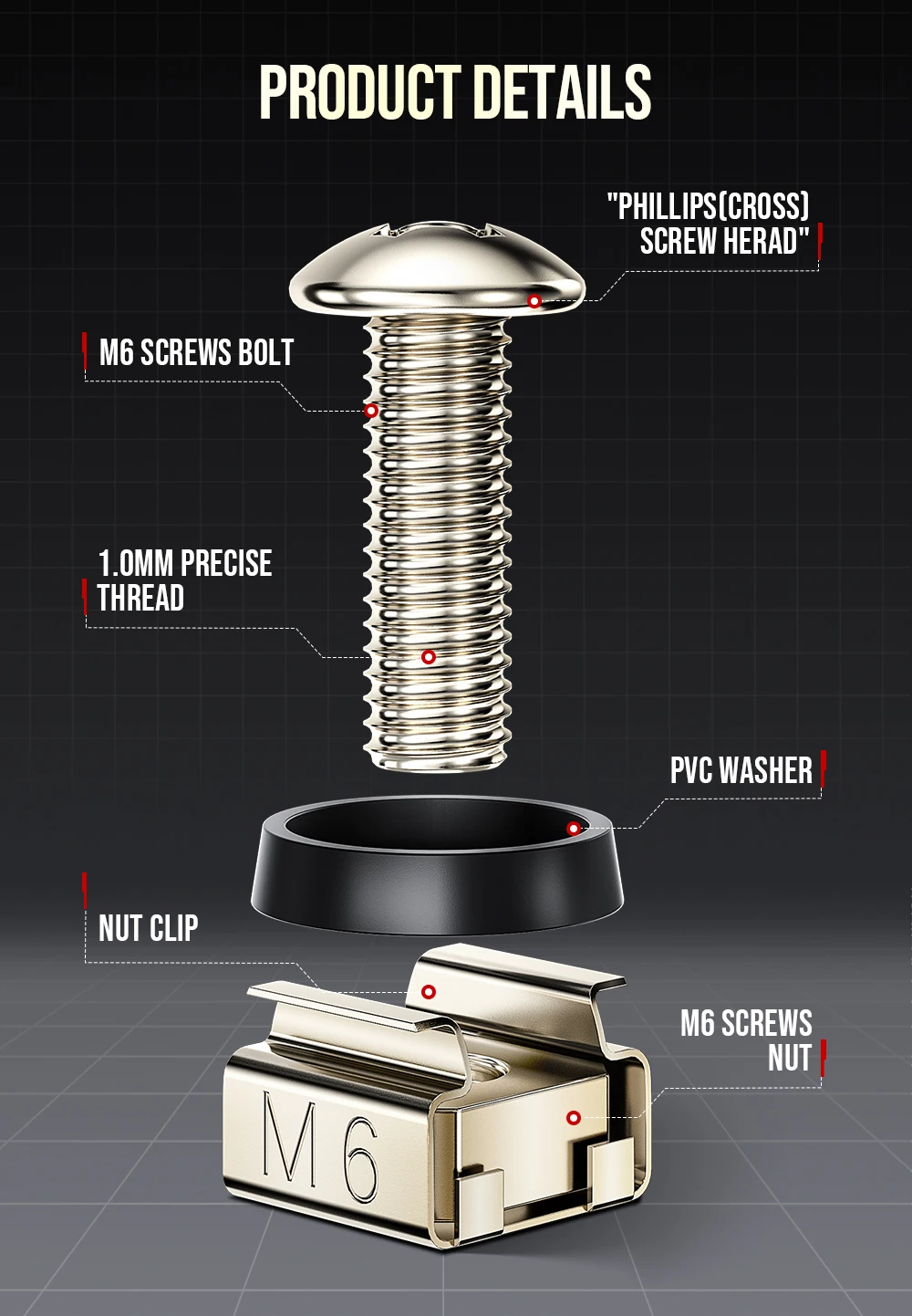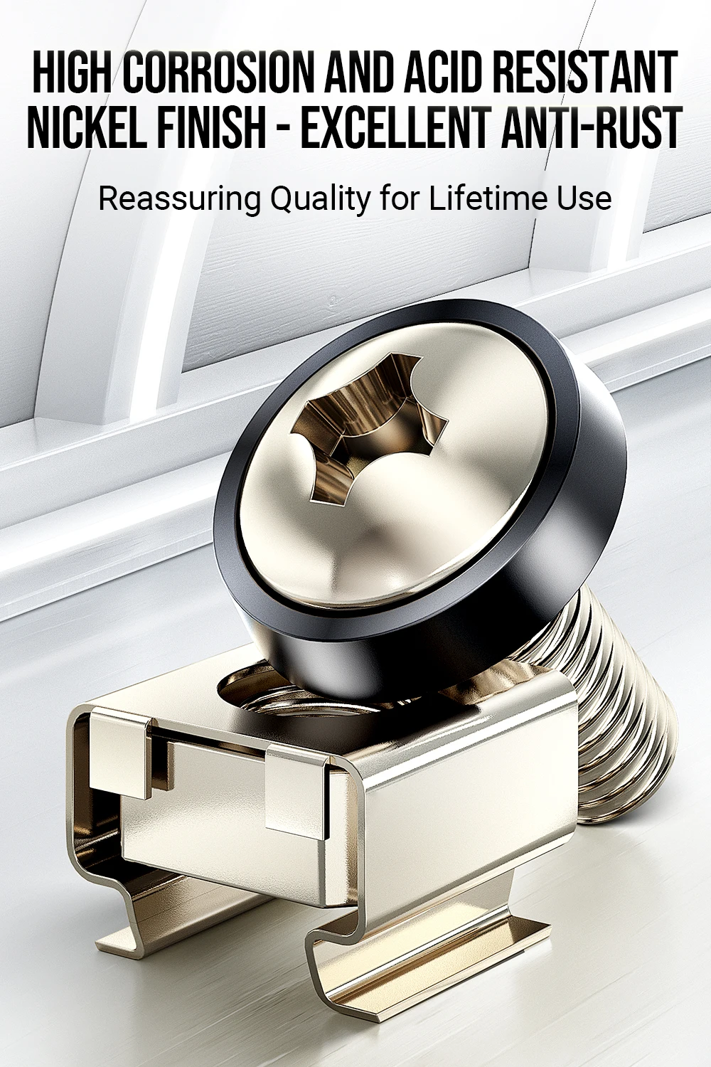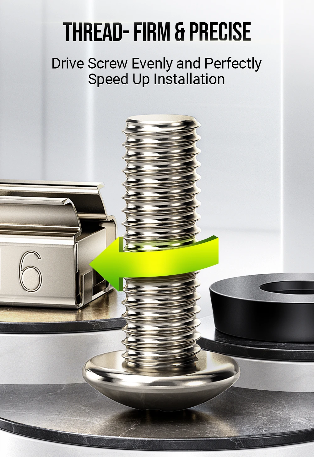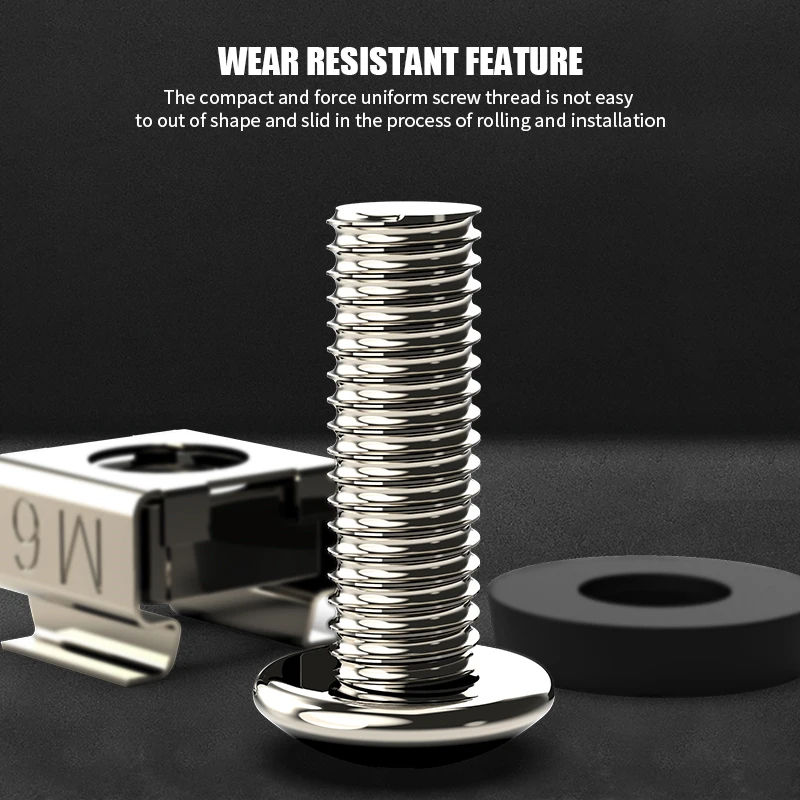 【Métrico estándar】 Nuestros tornillos M6 y tuercas de jaula están de acuerdo con el sistema métrico estandarizado.Y el error medio es inferior a 0,01 mm.La rosca del tornillo es muy afilada, limpia y precisa sin rebabas.La rosca de tornillo compacta y uniforme de fuerza no se deforma ni se desliza fácilmente durante el proceso de laminación e instalación.La cabeza transversal plana profunda y clara puede facilitar su trabajo y mejorar la eficiencia de su trabajo.