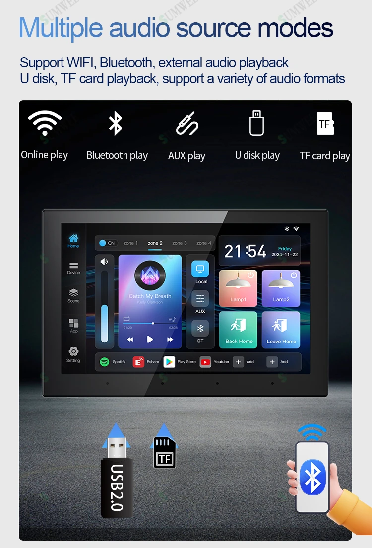 *Este dispositivo es un host de música, utilizado principalmente para el sistema de música de fondo doméstico, y el dispositivo inteligente TUYA tiene una función extendida, el dispositivo inteligente TUYA debido al punto de control, el dispositivo TUYA controlable solo es parcialmente efectivo.