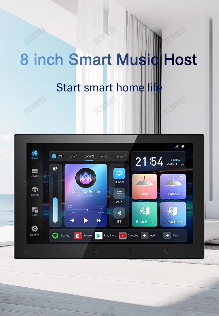 Amplificador de pared de audio de 4 zonas, panel de control de hogar inteligente tuya, 8x30W, RJ45, sistema Android 11, reproductor de música con sonido y pantalla táctil de 8 pulgadas