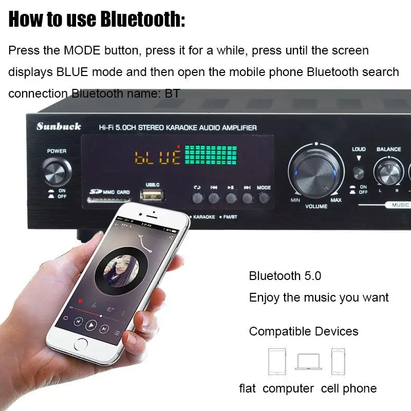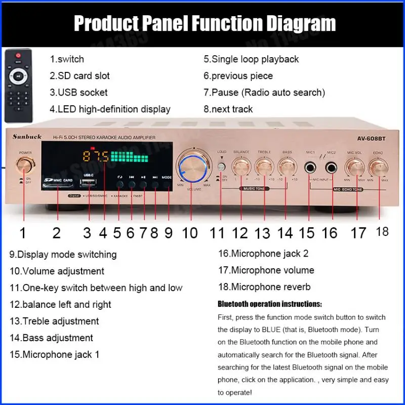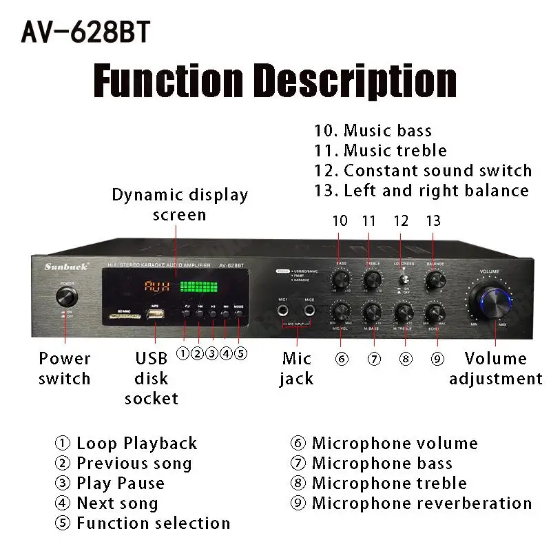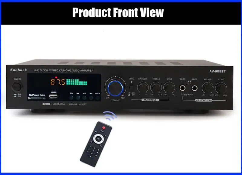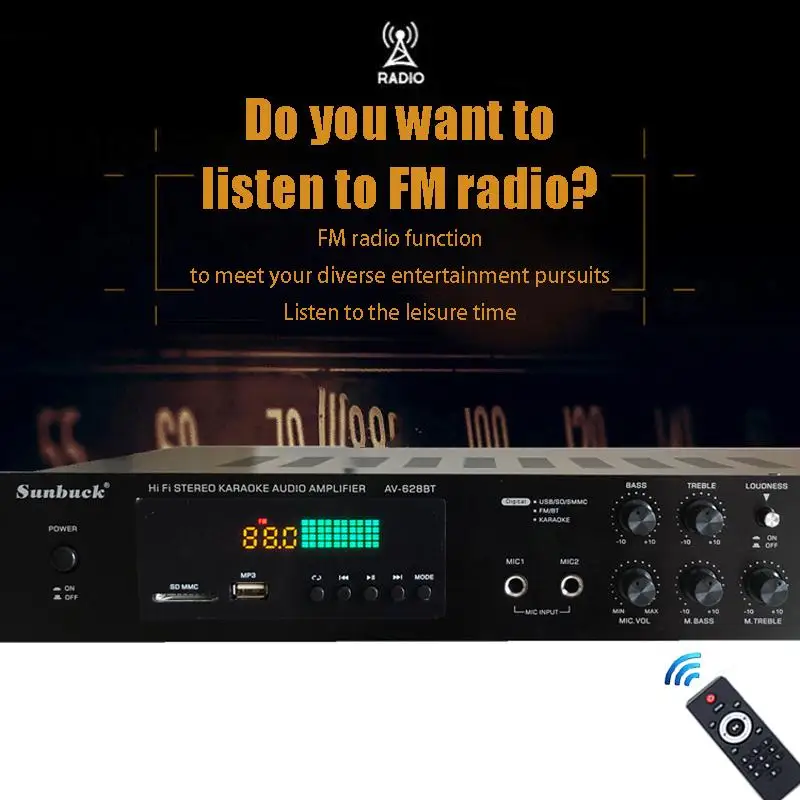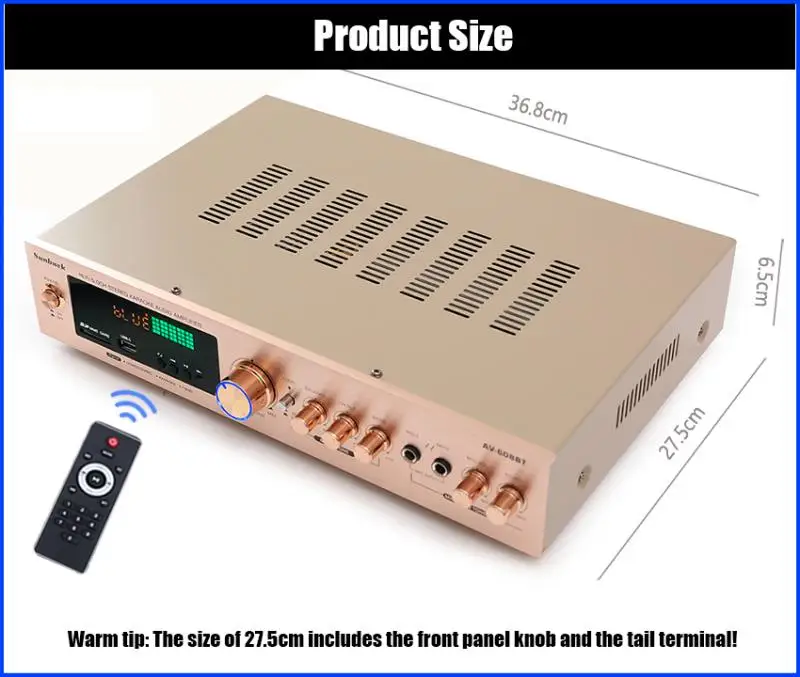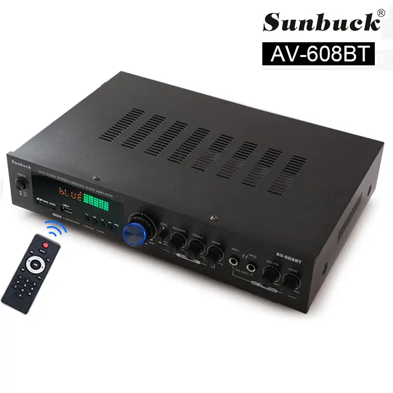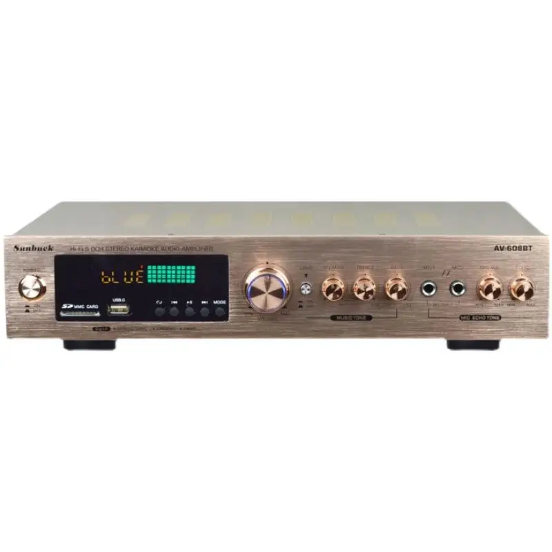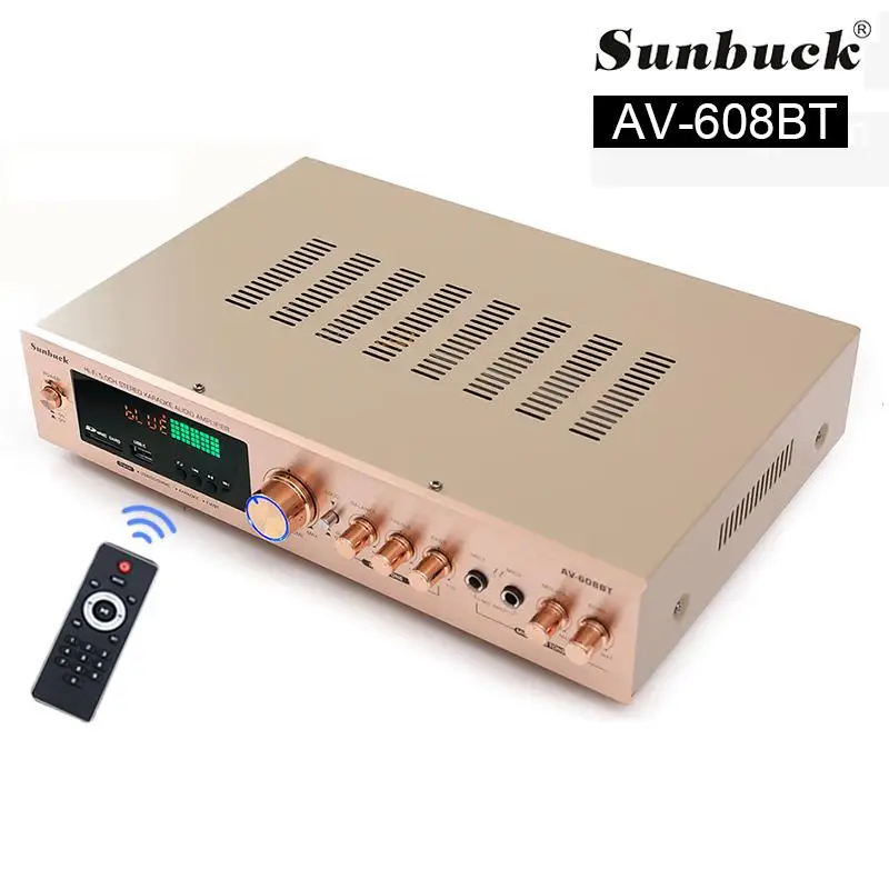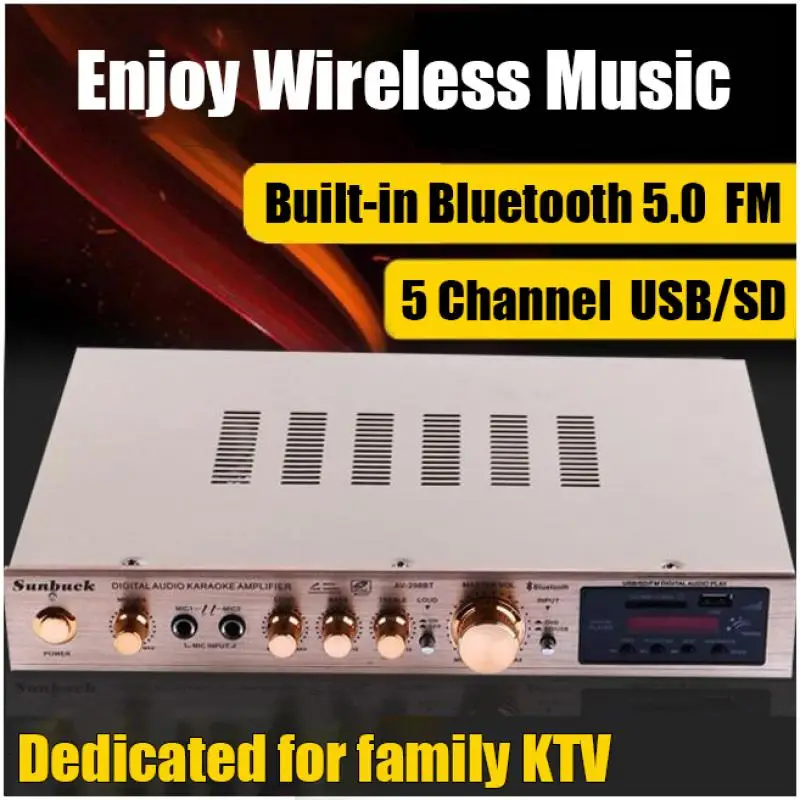Nota: 1. Amplificador de la marca SUNBUCK,Enchufe estadounidenseEs110V;Enchufe europeoEsSoldador de plasma de 220V, máquina de soldar, 48cmx26cmx37cm, 50A... Seleccione la especificación adecuada de acuerdo con el voltaje de su país antes de realizar el pedido para evitar quemar el amplificador.2.628BT se ha actualizado a la versión Bluetooth integrada, y la nueva versión no incluye Bluetooth externo.Descripción:1. Este amplificador es un amplificador con sonido surround multifuncional que es adecuado para Hi-Fi, cine en casa o para eventos pequeños y karaoke.2. Las entradas RCA estéreo y la entrada Jack se pueden conectar con todo tipo de equipos de audio, como reproductores de MP3, reproductores de DVD y ordenadores, y pueden enviar el sonido a un total de 5 altavoces.3. Como una adición útil a su función de alta fidelidad y cine en casa, también cuenta con dos entradas de micrófono en el panel frontal que le permiten entretenerse en eventos PA, fiestas de karaoke o reuniones.4. El dispositivo también ofrece un receptor de radio integrado para sintonizar todas sus estaciones de radio favoritas.Característica:1.5.0 amplificador de conexiones de altavoz con radio2,1120 W máx. Rendimiento general3. Volumen del micrófono ajustable4. Se suministra con control remoto5. Controles iluminados azules6. Pantalla LED7. Efecto de retardo de micrófono ajustable8. Admite radio FM/AM.Especificación:-- Potencia máxima: 500W + 500W + 120W-- Voltaje nominal: 110V/220V-- RMS:250W + 250W + 120W-Tasa de distorsión: 0.01%-- Impedancia: 4 a 16 Ohm-- Canal: 5 canales de sonido-- Tipo de amplificador de potencia: amplificador de potencia AV-- HiFi: soporte-- Bluetooth Visión: 5,0-- Color: Negro-- Material: aleación de aluminioEmpaquetado incluido:1 x Amplificador1 control remoto1 manual en inglés1 x tarjeta USB de 32GB (regalo)Modelo: 628BT