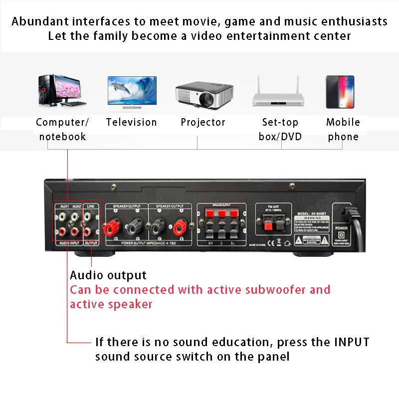 Nota: 1. Amplificador de la marca SUNBUCK,Enchufe estadounidenseEs110V;Enchufe europeoEsSoldador de plasma de 220V, máquina de soldar, 48cmx26cmx37cm, 50A... Seleccione la especificación adecuada de acuerdo con el voltaje de su país antes de realizar el pedido para evitar quemar el amplificador.2.628BT se ha actualizado a la versión Bluetooth integrada, y la nueva versión no incluye Bluetooth externo.Descripción:1. Este amplificador es un amplificador con sonido surround multifuncional que es adecuado para Hi-Fi, cine en casa o para eventos pequeños y karaoke.2. Las entradas RCA estéreo y la entrada Jack se pueden conectar con todo tipo de equipos de audio, como reproductores de MP3, reproductores de DVD y ordenadores, y pueden enviar el sonido a un total de 5 altavoces.3. Como una adición útil a su función de alta fidelidad y cine en casa, también cuenta con dos entradas de micrófono en el panel frontal que le permiten entretenerse en eventos PA, fiestas de karaoke o reuniones.4. El dispositivo también ofrece un receptor de radio integrado para sintonizar todas sus estaciones de radio favoritas.Característica:1.5.0 amplificador de conexiones de altavoz con radio2,1120 W máx. Rendimiento general3. Volumen del micrófono ajustable4. Se suministra con control remoto5. Controles iluminados azules6. Pantalla LED7. Efecto de retardo de micrófono ajustable8. Admite radio FM/AM.Especificación:-- Potencia máxima: 500W + 500W + 120W-- Voltaje nominal: 110V/220V-- RMS:250W + 250W + 120W-Tasa de distorsión: 0.01%-- Impedancia: 4 a 16 Ohm-- Canal: 5 canales de sonido-- Tipo de amplificador de potencia: amplificador de potencia AV-- HiFi: soporte-- Bluetooth Visión: 5,0-- Color: Negro-- Material: aleación de aluminioEmpaquetado incluido:1 x Amplificador1 control remoto1 manual en inglés1 x tarjeta USB de 32GB (regalo)Modelo: 628BT
