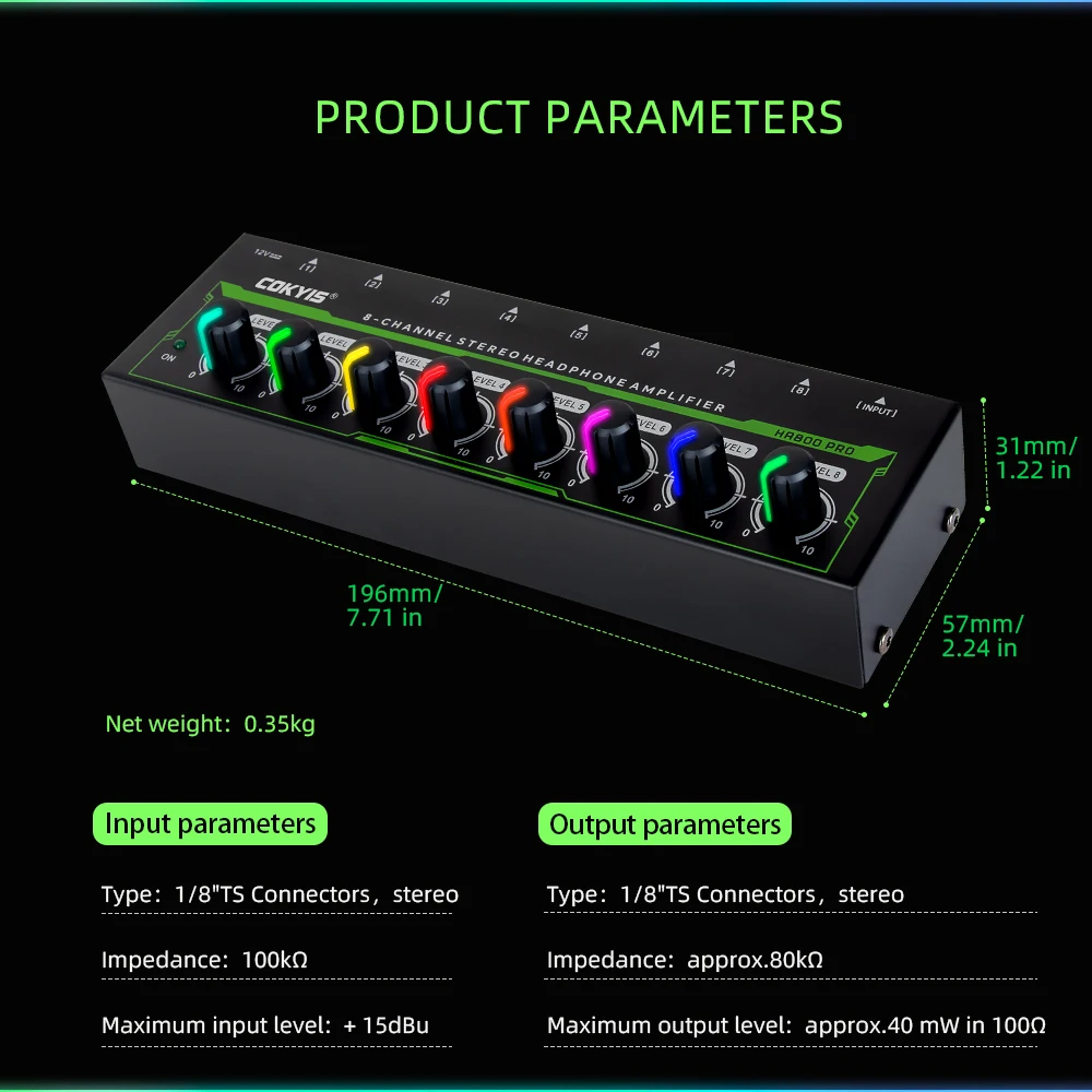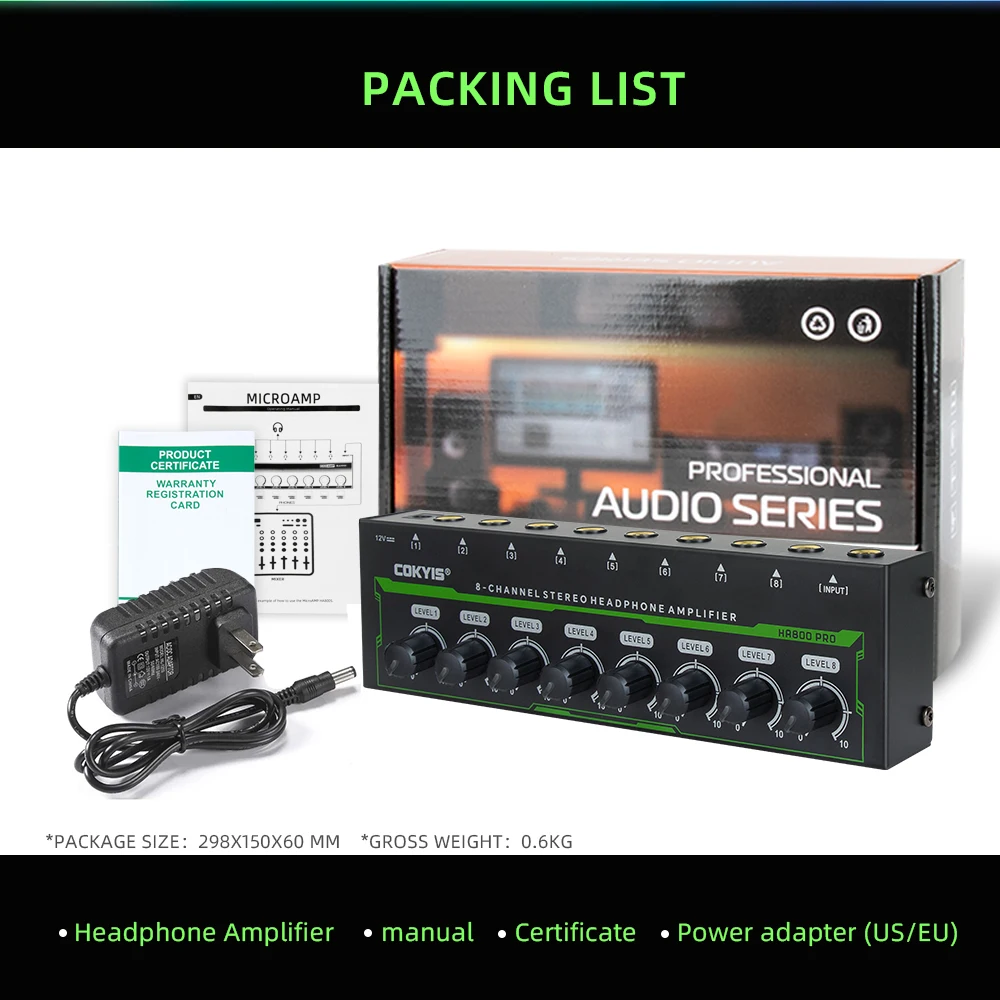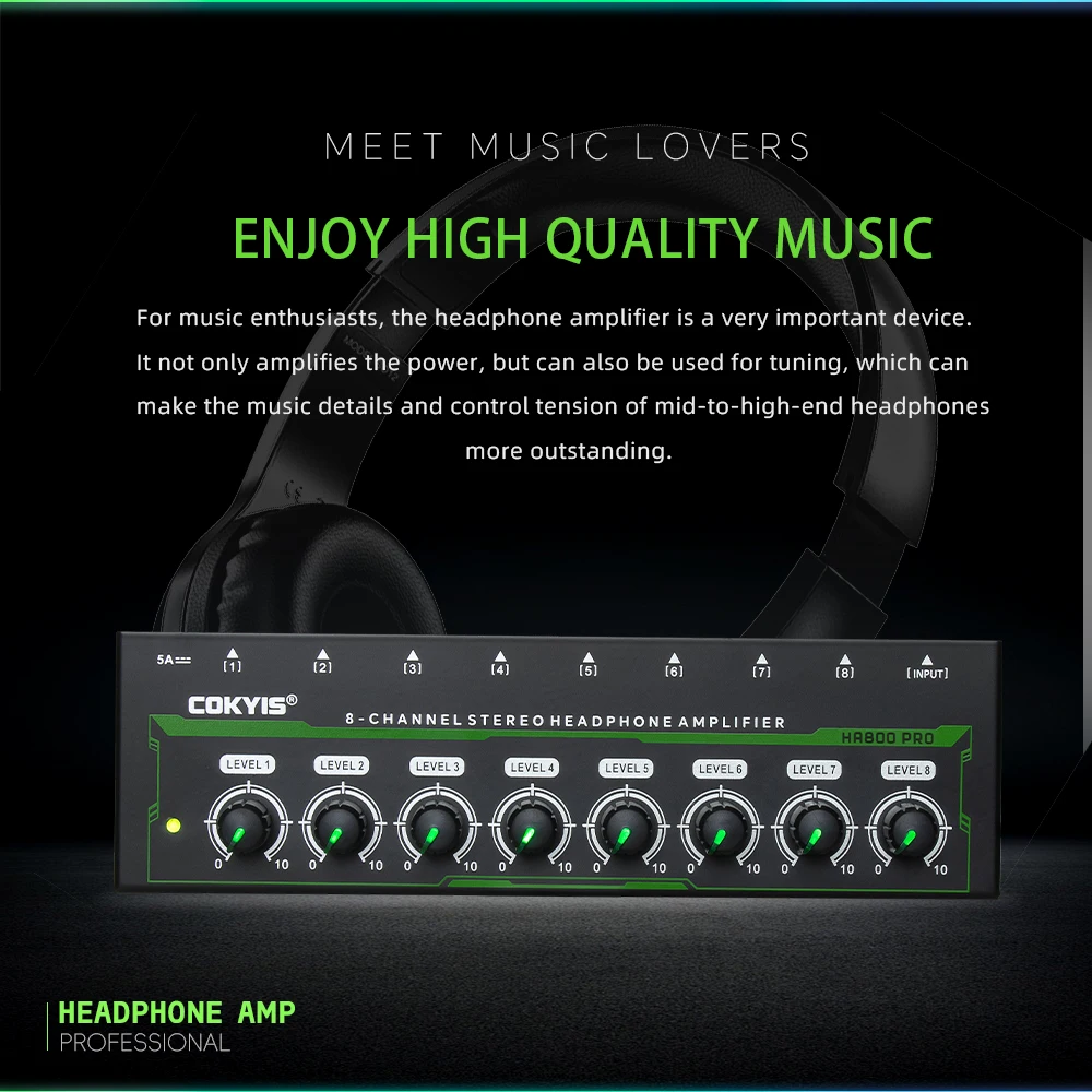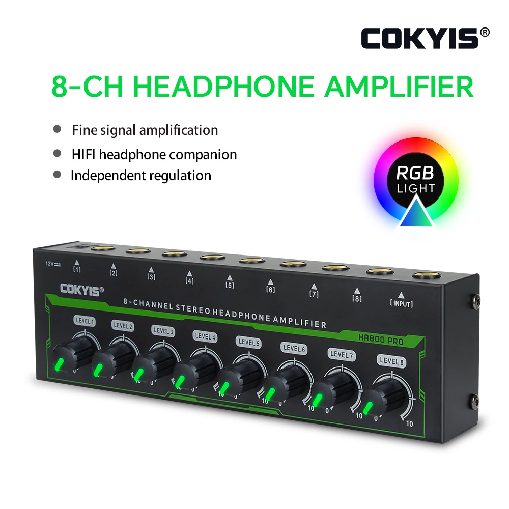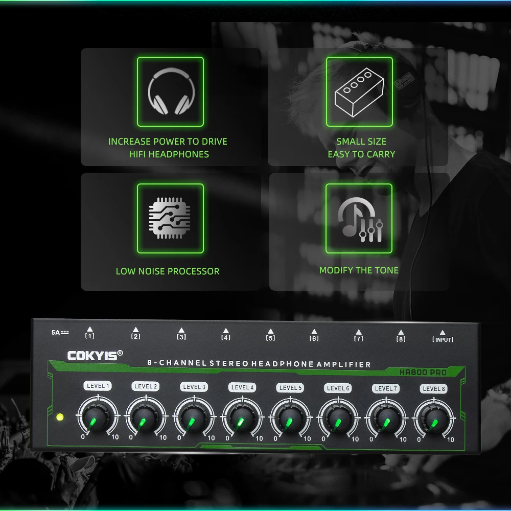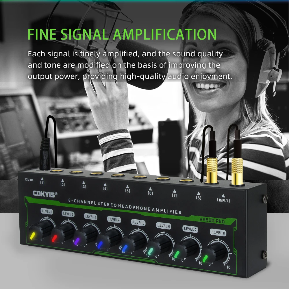 Diseñado con 8 canales de salida de auriculares y 1 canal de entrada, el amplificador de auriculares HA800 es capaz de manejar potentes configuraciones de audio, brindándole música precisa y consistente.