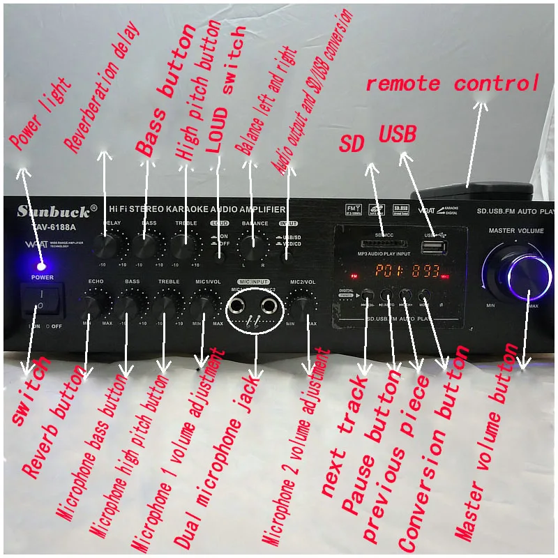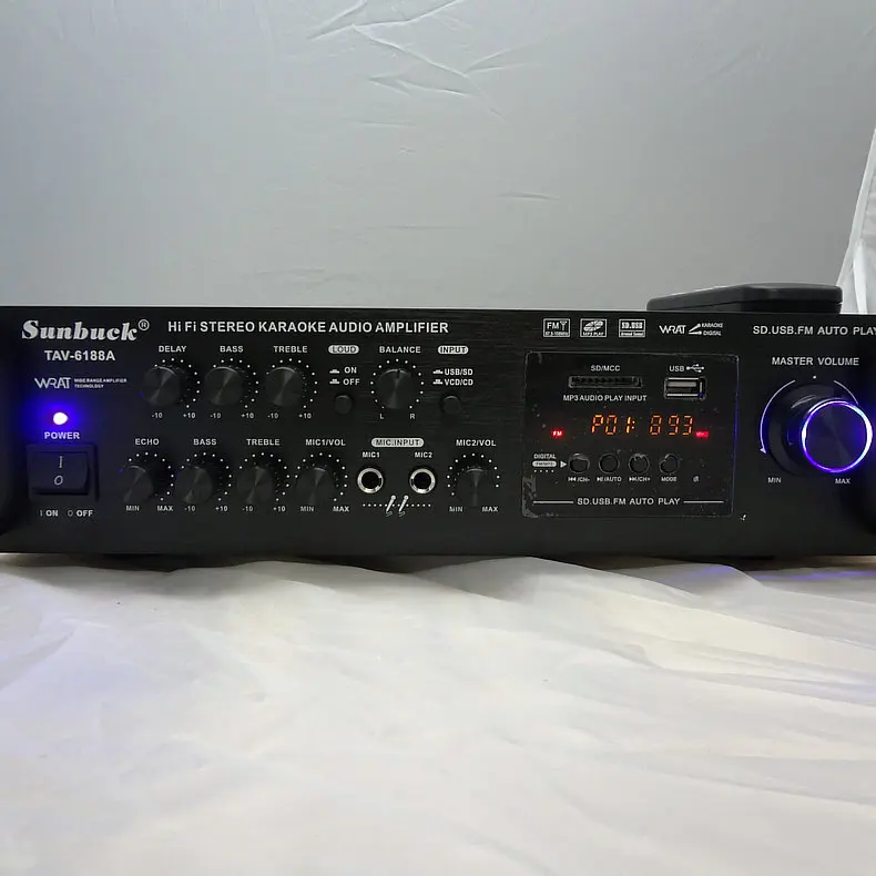 Descripción del producto:1............ función de reproducción de memoria de potencia2............ interruptor de protección de altavoz de la máquina3............ Función de protección contra cortocircuitos4............ función de protección contra sobrecarga5............ reproducción del disco U insertado en tarjeta enchufable6............ Función de reproducción de radio FMSoporte: tarjeta insertada en disco U, entrada de audio (DVD/VCD/CD/MP3/computadora, etc.)Resistencia de carga............ 4 Europa -16 EuropaSensibilidad de entrada......... 100mVResistencia de entrada............ 47KΩRelación señal-ruido............... 80dBDistorsión Yibo................ 0,01%Respuesta de frecuencia............ 20Hz-40KHzPierde también sensibilidad.................... 100mV 500mVtono:Ajuste de graves............. + - 12dB (100Hz)Ajuste del tweeter.............. + - 12dB (100Hz)Sección de karaoke:Sensibilidad de salida del micrófono................. 10mV 30mV