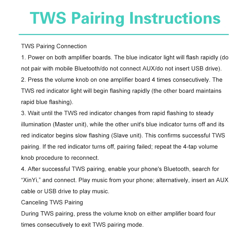 During the TWS box connection process, press the volume knob of any amplifier board four times in a row to exit the TWS box connection mode.