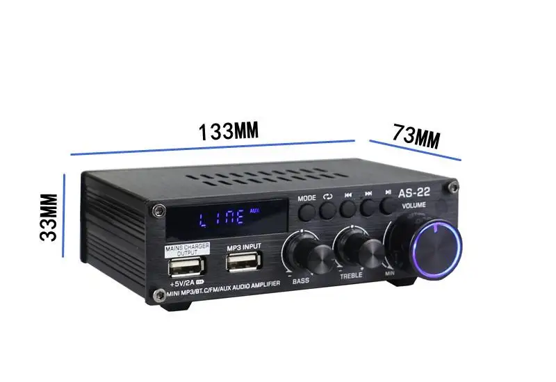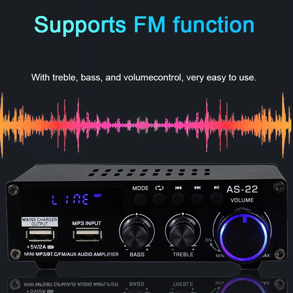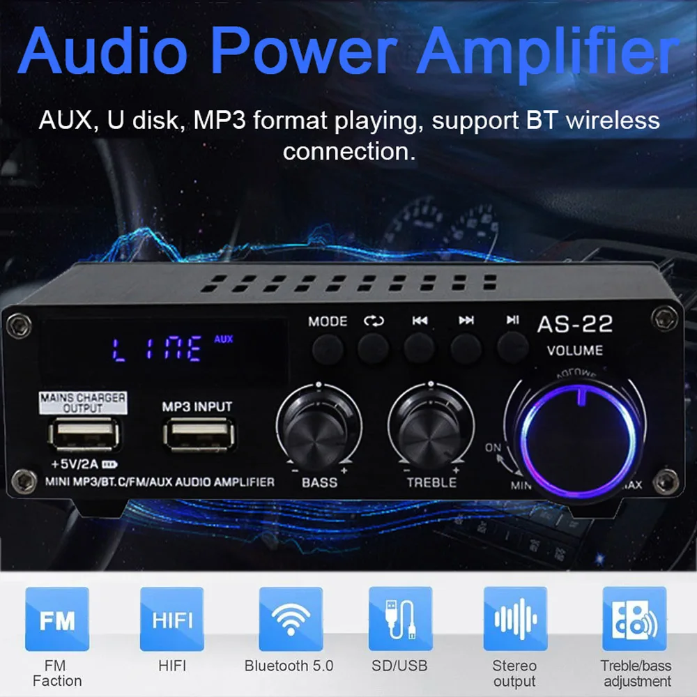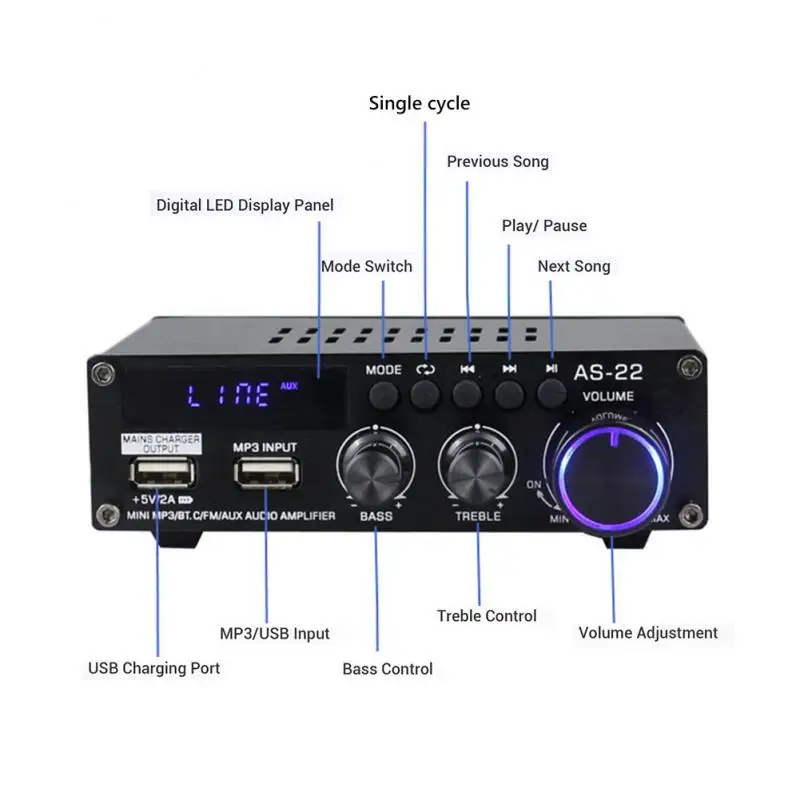 AK45 admite entrada de micrófono, AS22 no admite entrada de micrófono. Por favor, elija según sus propias necesidades, amigos. Ambos productos tienen una alta relación costo-rendimiento.Modelo: AS-22Características:-Mini amplificador de potencia de audio digital HIFI Bluetooth.