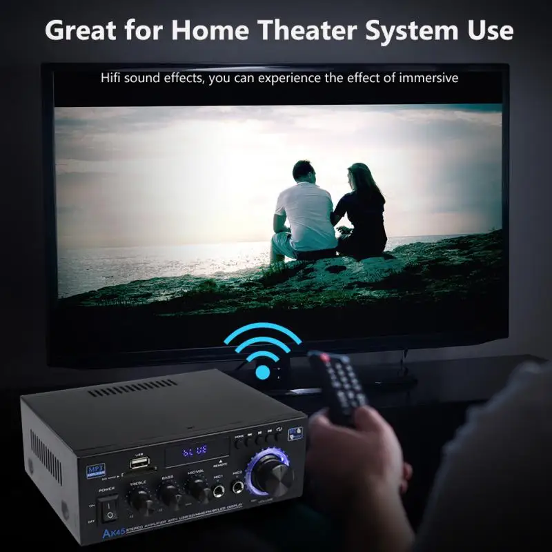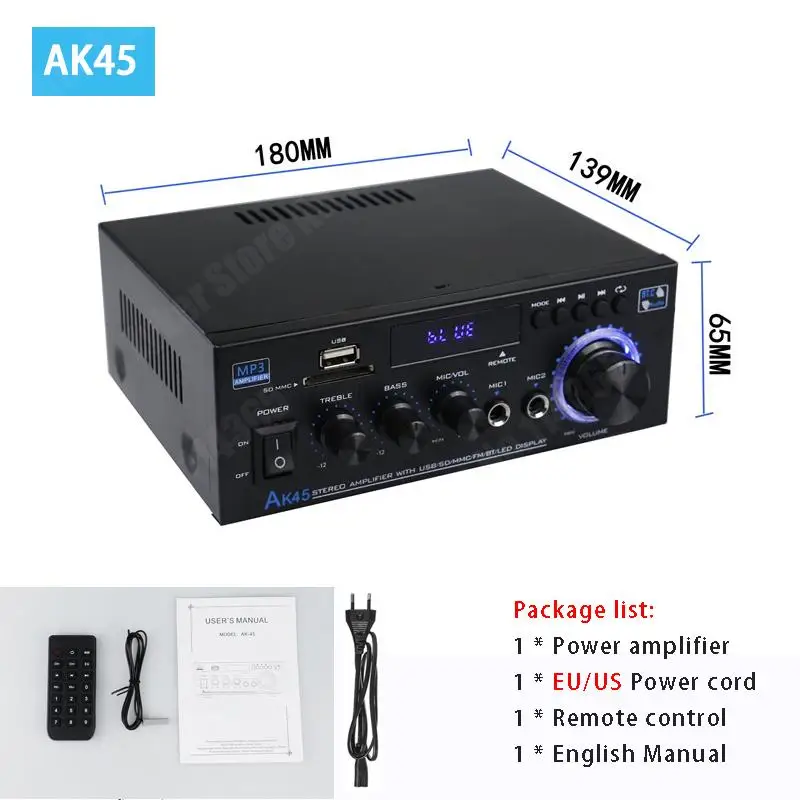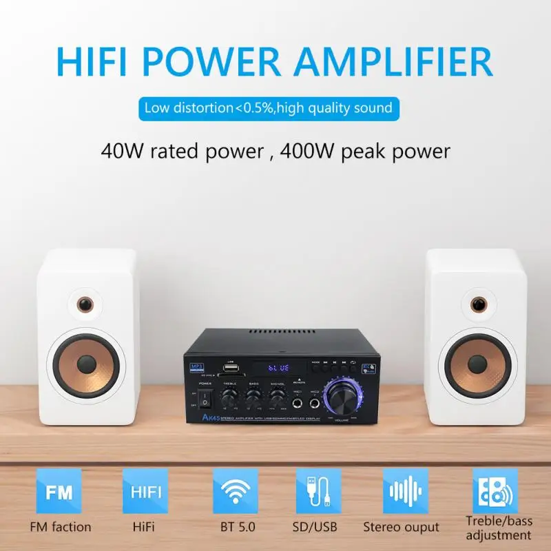 Comprar Amplificador Digital HiFi AK45 con Bluetooth, amplificador de sonido envolvente 2,0, Canal MP3, compatible con 90V-240V, máx. 350W x 2, para casa y coche