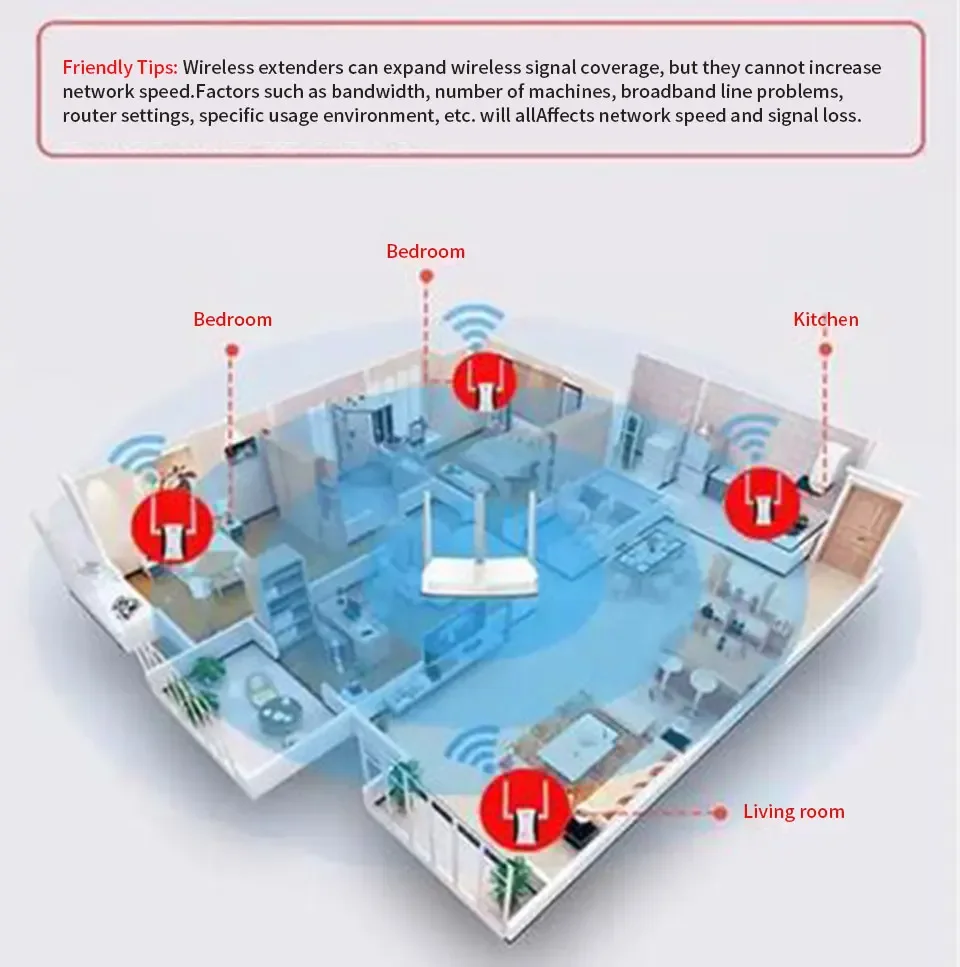 R1: De acuerdo con el protocolo de transmisión inalámbrica, todos los dispositivos repetidores están configurados para funcionar en modo semidúplex en lugar de dúplex completo. En otras palabras, el router(o AP) y los clientes del terminal; así que la transmisión El tiempo se incrementará el doble, mientras que la velocidad disminuye. Recomiendo que se conecte al extensor cuando la conexión de red doméstica sea deficiente o cuando desee una cobertura inalámbrica más grande para eliminar las "zonas muertas"