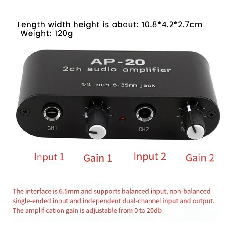 Amplificación independiente de doble canal, ajuste de ganancia independiente (0-20DB), los dos canales se pueden usar solos o al mismo tiempo sin afectarse entre sí;