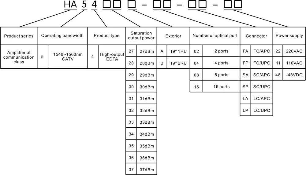 Observación: 1. Todos los EDFA de la serie HA5400 con potencia de salida especificada y puertos de salida pueden estar en carcasa 2U.