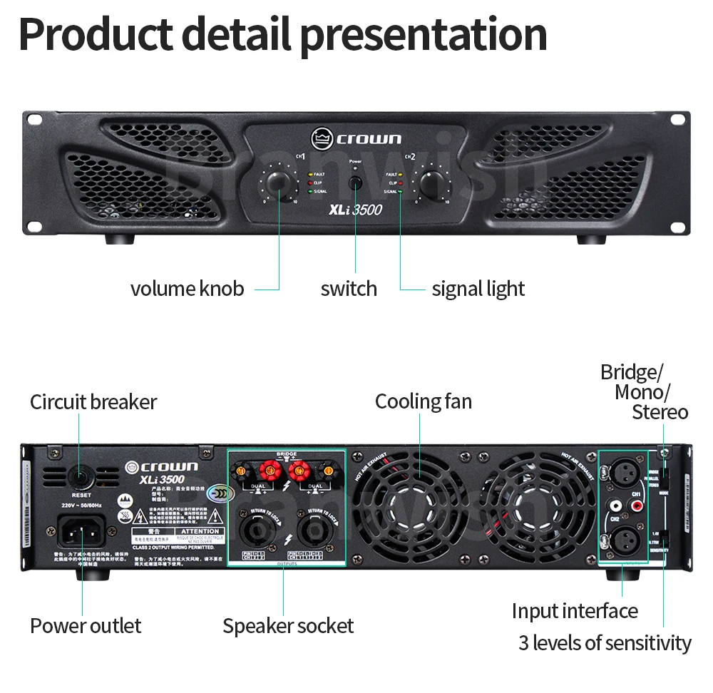 Potentes, asequibles y confiables: estas palabras definen el amplificador de potencia XLi 3500 de Crown, así como el resto de los amplificadores de la serie XLi.Si usted es músico, DJ o ingeniero de sonido en vivo, seguramente apreciará lo que puede hacer este amplificador notablemente resistente para su sistema de megafonía.Con una sensibilidad de entrada seleccionable por el usuario (.755 V o 1,4 V) y una serie de conectores de salida estándar, el XLi 3500 de 2.700 vatios es perfecto para equipos móviles, lugares tradicionales y casas de culto por igual.Y con más de seis décadas fabricando algunos de los amplificadores de potencia más populares de la Tierra, sabes que puedes confiar en Crown y tu XLi 3500 sin importar.
